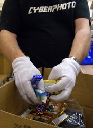 Jag kan skvallra att dagens vinnare har beställt bland annat en kameraväska och ett EF-S 55-250 IS objektiv från Canon. På bilden lastar Lennart ner chokladen i lådan.