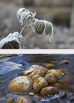 Som redan nämnt i föregående blogginlägg har vi äntligen fått lite snö. Tyvärr är det plusgrader idag så nu är allt borta redan, så för att hinna ta bilder på frosttäckta löv och istäckta stenar i vattendrag den här årstiden får man vara ute på morgonkvisten.