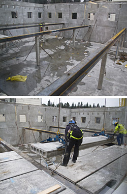 Innan dagen är slut så ligger golvet på plats i vår utbyggnad. Betonggolv. Fascinerande att se hur den stora kranen placerar de tunga golvdelarna på plats med god precision. Kranföraren sitter i kranen på andra sidan betongväggen och ser ingenting utan styr kranen med hjälp av instruktioner från en kille inifrån bygget.