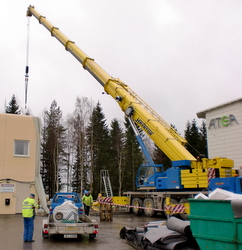 Ja, det ser ut som ett teleskopstativ, vår inhyrda jättekran som ska börja lyfta elementen på plats för vår tillbyggnad. Idag regnar det och är riktigt ruskväder, men i alla fall plusgrader så man fryser inte konstant.