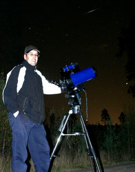Efter en lång stund blev det dags att säga god natt, så jag ställde upp kameran och tog en bild på mig själv och teleskopet (ännu är jag ingen astrofotograf, skall be att få återkomma i det ärendet ;-). Fick faktiskt med ett stjärnfall på bilden!