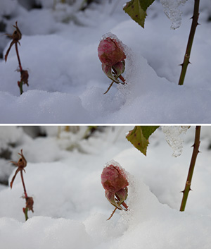 Jag tänkte ge dig ett fototips inför vintern. Snön är vit. Inte grå, inte blå, inte gul och verkligen inte rosa. Vinterbilder måste ofta överexponeras, men man får akta sig så att högdagrarna inte fräts ut. Jag föredrar absolut att fotografer i RAW-format. Jag ska visa ett exempel som jag snabbtog nyss. Bilden är inget konstverk utan ska bara illustrera en vinterbild. Den övre är en jpg direkt ur kameran och den nedre i RAW-format körd genom CaptureOne.
