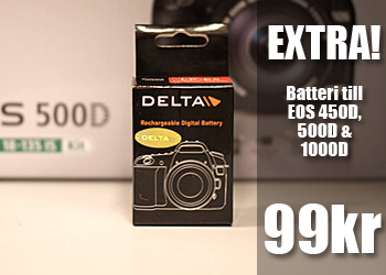 Kanske en EOS 1000D, 450D eller 500D? Då kan du just nu köpa ett extra batteri från Delta för endast 99kr! (Ord pris 299kr). Erbjudandet gäller ett begränsat antal så passa på! Extra batteri är alltid nyttigt att ha med sig när man är ute och fotograferar, speciellt om det är lite kallare, som nu på vintern.