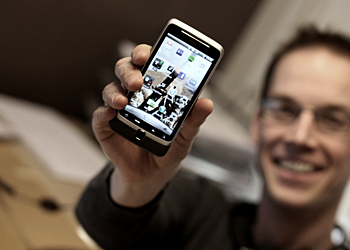 På bilden visar Peder, ansvarig för mobiltelefoni, sin nyaste testlur, en HTC Desire Z!