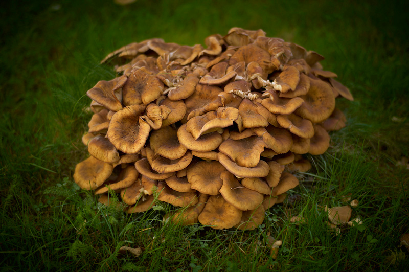 Igår kväll så såg jag denna svampfamilj trängas på en stubbe när jag var ute på kvällspromenaden. Nu imorse när jag tog bilden hade någon trampat på den så den var lite skadad, tyvärr. Men det är en intressant syn ändå...