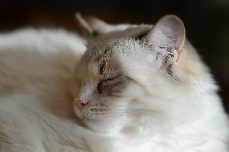 Bilden ovan är naturligtvis tagen med Nikon D4. Optiken var en Leica APO-Macro-Elmarit-R 100/2,8. Bilden är tagen i det värsta ljus en stackars kamera kan råka ut för. En vit katt i fullt, hårt, dagsljus och halva motivet i skugga.