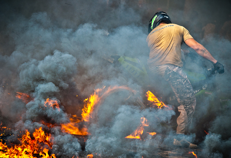 Nu korar vi vinnaren med pompa och ståt - Christian Lundgren! Bilden är tagen i Örebro där gänget Gävle Stunts visar upp sina färdigheter. Oavsett motorintresse eller inte så är det rejält med Action i den här bilden. Eld, rök, man hör hur det ylar från motorcykeln, säkert hög musik i bakgrunden och man känner doften av röken och det brända gummit...