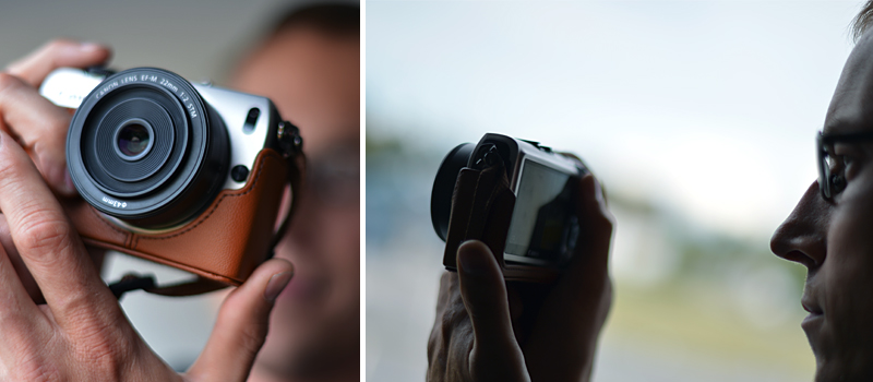 När man plockar fram EOS M så är det första som slår en troligen samma sak som du reagerar över när du ser bilden ovan. Kameran i silver och den läckra väskan i brunt skinn. Ja, kombination och själva väskan är det första man ser och det känns positivt. Ett litet wow! Canon har dock inte gjort en Leica-kopia utan man har gjort något helt eget. EOS M känns mer som en storebror i Powershot-serien än en Leica.