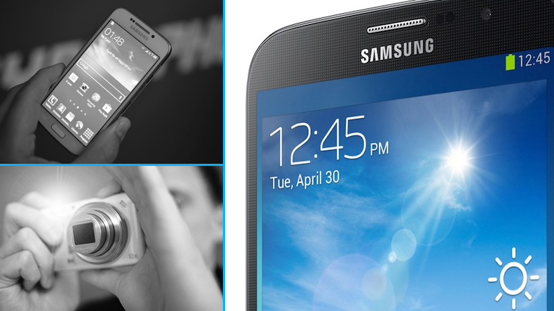 Nyheten Galaxy Zoom ser du till vänster på bilden ovan. Vi har redan fått känna och klämma på den och för dig som gillar fotografering är det inte alls en dum produkt att kika närmare på. Det är en S4 Mini i grunden som fått en rejäl kamera inbyggd, påbyggd eller hur man nu ska beskriva det. Fördelen är så klart bildkvalitén som hamnar på en helt annan nivå än konventionella mobilkameror klarar av. 10x optisk zoom, bildstabilisering och 16 Mpixel beskriver det ganska bra.