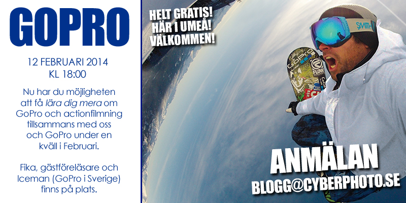 Kvällen den 12 februari kl 18:00 är du välkommen till oss för att lära dig mera och få inspiration till att utveckla ditt filmande med GoPro och CyberPhoto! Helt utan kostnad och du är hjärtligt välkommen till oss på Gräddvägen 5 i Umeå. Det finns platser kvar så se till att anmäla dig redan nu...