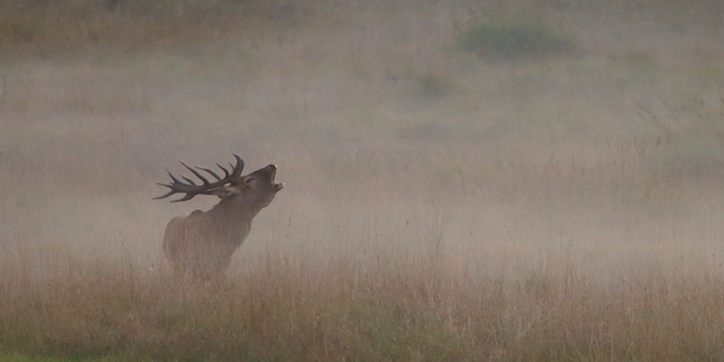 Janne skriver att nu börjar brunsten att klinga av, platshjorten på spelplatsen där han fotograferar har kämpat hårt i en månad med rivaler och börjar således bli trött och halt. Igår kväll ville han bara sova men lyfte huvudet ibland för ett avslutande bröl och sen vidare in i dimman. Kronhjorten är inget litet djur...de vi har i Sverige kan väga över 200kg och uppemot 300kg i unika fall. Hinden (honan) blir betydligt mindre, ungefär halva vikten jämfört med hanhjorten.
