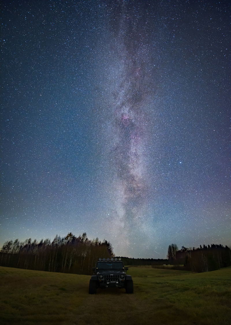 Denna bild är långt ifrån perfekt. Jag skulle kunna trolla till den mer i photoshop genom att centrera öppningen i skogen och justera bilen till vintergatans mitt, men det kommer jag att göra i verkligheten nästa gång jag tar en liknande bild. Det här var mer ett experiment som gick över förväntan.