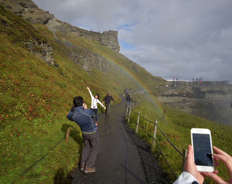 Den här bilden är tagen vid Gullfoss. Jag tyckte bilden blev lite rolig på paret som tar bild under regnbågen och den iPhone som kommer in i bilden från höger...