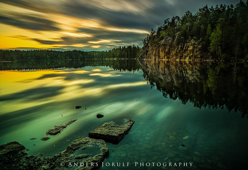 Åker fram till platsen jag sett ut och riggar upp utrustningen. Mitt Sirui stativ och Lee filter sitter fint på min Nikon D800e som jag toppar med ett Zeiss Distagon 21 mm. Jag älskar kombinationen Nikon och Zeiss då allt är manuellt och jag bestämmer varje drag av bild och teknik. Så kommer stunden, vet att jag inte har lång tid på mig, högst 45 minuter, kanske något mindre. Midsommarnatten lyser upp och solen försvinner långt borta i horisonten. Jag sätter i mitt filter med ND 10, ett heltäckande gråfilter i glas och toppar med ett polariseringsfilter. Kameran ställer jag in på ISO 100, bländare f/6,3 och en tid på 5 min. Jag hinner ta fyra bilder innan magin i ljuset försvinner. Väl hemma sätter jag mig med Lightroom och kikar på bilderna. Jag fastnar för en av dem, beskär bilden något och lättar upp den samtidigt som jag stärker kontrasten i ett par partier. Lägger ut bilden på 500px.com och på min Facebook-sida. Mottagandet har varit fantastiskt vilket glädjer mig mycket. Jag bestämmer mig för att bilden skall få ett eget uppslag i min nya landskapsbok. Cirkeln är sluten och jag kan färdigställa boken.
