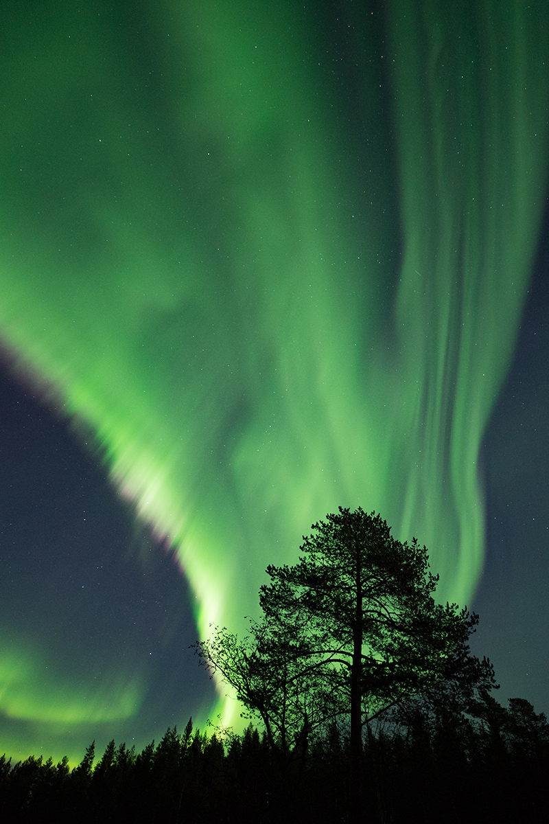 Det var mycket folk som fotograferade norrsken runt sjön vi var vid. Kul att träffa så många likasinnade, det var verkligen alla åldrar, alla typer av kameror, och både män och kvinnor. Intresset och entusiasmen var på topp, och mitt i showen så dyker ett kraftigt band över himlen och det gick ett gemensamt "wow" över sjön. Den delen av showen är vad du ser på denna bild. Även om en kamera har bättre mörkerseende än mig och även om man justerar till bilden i datorn så kan en bild aldrig återge upplevelsen av att se norrskenet dansa över himlen på riktigt. Bilden tagen med Nikon D5.