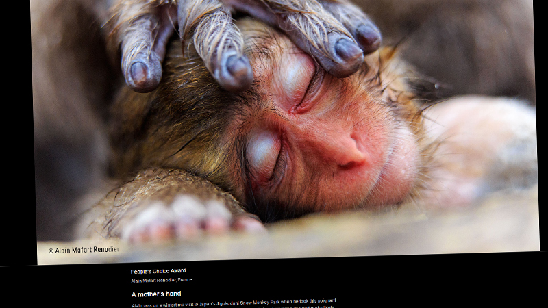 Den bilden som du ser här ovan är tagen av Alain Mafart Renodier från Frankrike och den heter "A mothers hand" och visar en liten makak vars mamma håller handen över huvudet för att skapa trygghet och närhet till sin unge. Flera fantastiska bilder hittar du via länken, härlig inspiration för dig som ska resa till varmare breddgrader! Vill du se mera apor så bläddra ett par veckor bakåt i Bloggen så får du se makaker som vi plåtat i Thailand med Nikon D500.