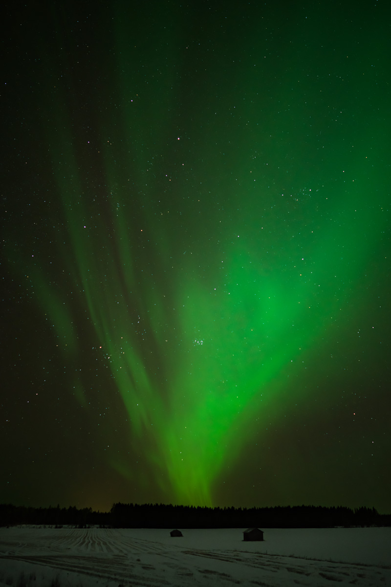 Batteriet laddat, minneskortet tomt, stativet uppe och mössan är på. Allt är redo och jag börjar på ta de första bilderna när jag hör något i skogen bakom mig. Skaren som sakta knäcks av något som har en tyngd större än vad skaren kan bära. Jag lyser dit med ficklampan för att som i vilken höjd ögonen skulle reflektera tillbaka på, men jag ser ingenting. Fortsätter att ta bilder och fler steg hörs. Samma sak, jag lyser med ficklampan men ser ingenting. Det händer några gånger till. Tur att jag inte är mörkrädd. Det kan inte vara en björn då de ligger i ide nu, det borde inte vara en varg, förhoppningsvis inte i alla fall. Så om det är en nyfiken räv så skulle det bara var gulligt och var det en nyfiken älg så har de inte kalvar eller är i brunst just nu så det skulle inte heller vara speciellt farligt. Problemet med älgar är att de är förunderligt tysta och de kan faktiskt gå till anfall. Men det hade varit skönt att veta vad som fanns där. Jag startade bilen och riktade de mer än hälsosamt många extraljusen mot området och såg... just det... ingenting... så jag och en okänd "kompis" njöt av norrskenet tillsammans. Lite läskigt att inte veta vad som smög i skogen.
