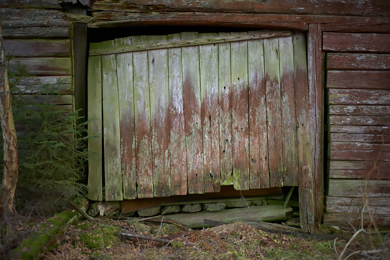 Jag gillar normalt att göra svartvita bilder från ödehus men på denna gård så fanns det så mycket färger och denna dörr fascinerade mig. Dels dess färgskala och dels när jag ser hur den är byggd. Därför undrar jag om den någonsin passat bra i den dörröppningen. Inte en bräda är ju sågad rak.