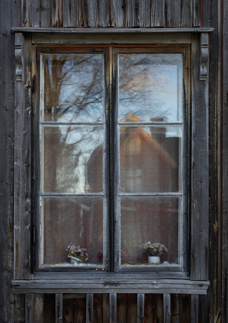 Jag tar med ett par bilder till från förra helgen. Jag hoppas att både du och jag hittar nya spännande motiv att fotografera denna helg. Jag tyckte denna bild triggade fantasin och nyfikenheten. Dels för de blommor som finns i fönstret men också reflektionen i glasrutan från ett annat hus. Är det också övergivet? Vem bodde här?. Bilden bevisar i alla fall en sak och det är att plastblommor står sig bra utan att vattnas på många år. Vi tar en sista bild i morgon, det får bli på en gullig ren.