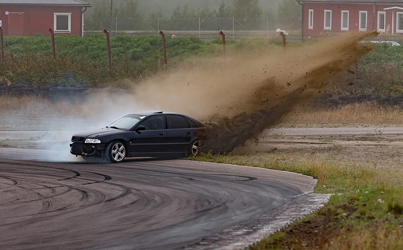 Jag börjar bildsviten med denna bild som jag tycker förmedlar både action och bus. Lämplig bakgrundsmusik till denna bild skulle nog vara Metallica. Kände mig lite ringrostig som motorsportsfotograf men hittade en bra plats i depån, skyddad av en kraftig betongmur som i sin tur skyddas av däck och stora påsar med gullfiber. Det första som händer mig är att en av driftingbilarna får fetsladd och tappar kontrollen, varpå bilen hastigt blev större och större i sökaren tills den slutligen dammar in i skyddsvallen någon meter ifrån mig och sedan flyger ett gäng gummidäck högt över muren och landar mot en bil i depån. Det kändes som en alltför dramatisk start på en lång dag vid banan. Bilen var inte den på bilden då de bilderna som jag tog vid den händelsen inte hade så mycket bildvärde.