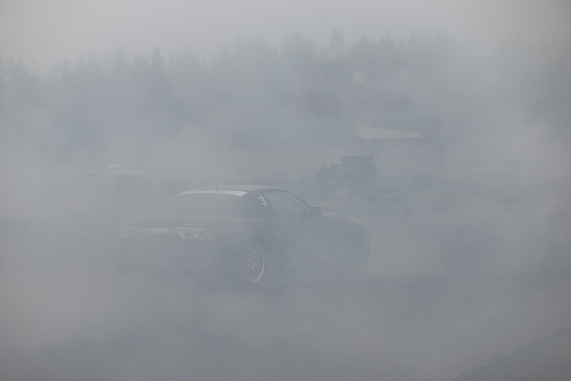 Det var en extremt dimmig dag. Lightrooms "Ta bort dimma" räddade många bilder. Men när det vankas burnout, ja då byggs dimman på med rök från någons bakhjul. Se gärna bilden i full storlek, det blir ändå coolt fast man knappt ser motivet.