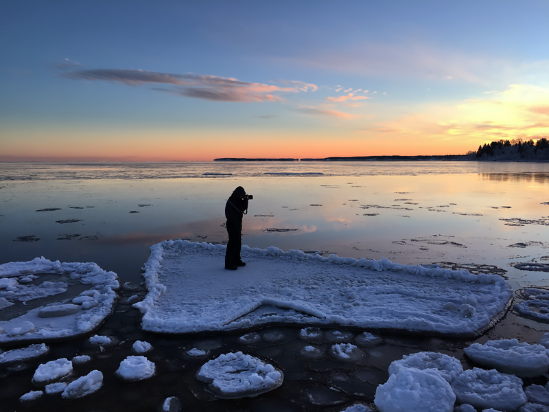 När jag fotograferade denna stormpiskade kust som nu äntligen får pusta ut lite så tog min fru denna bild med sin iPhone. Jag tyckte den var lite rolig att visa. Bäst att nämna att vattendjupet var kring stövelskaften. Det ser helt klart coolare ut på bild än det var i verkligheten. Imorgon ska vi titta på solen som är en måne...