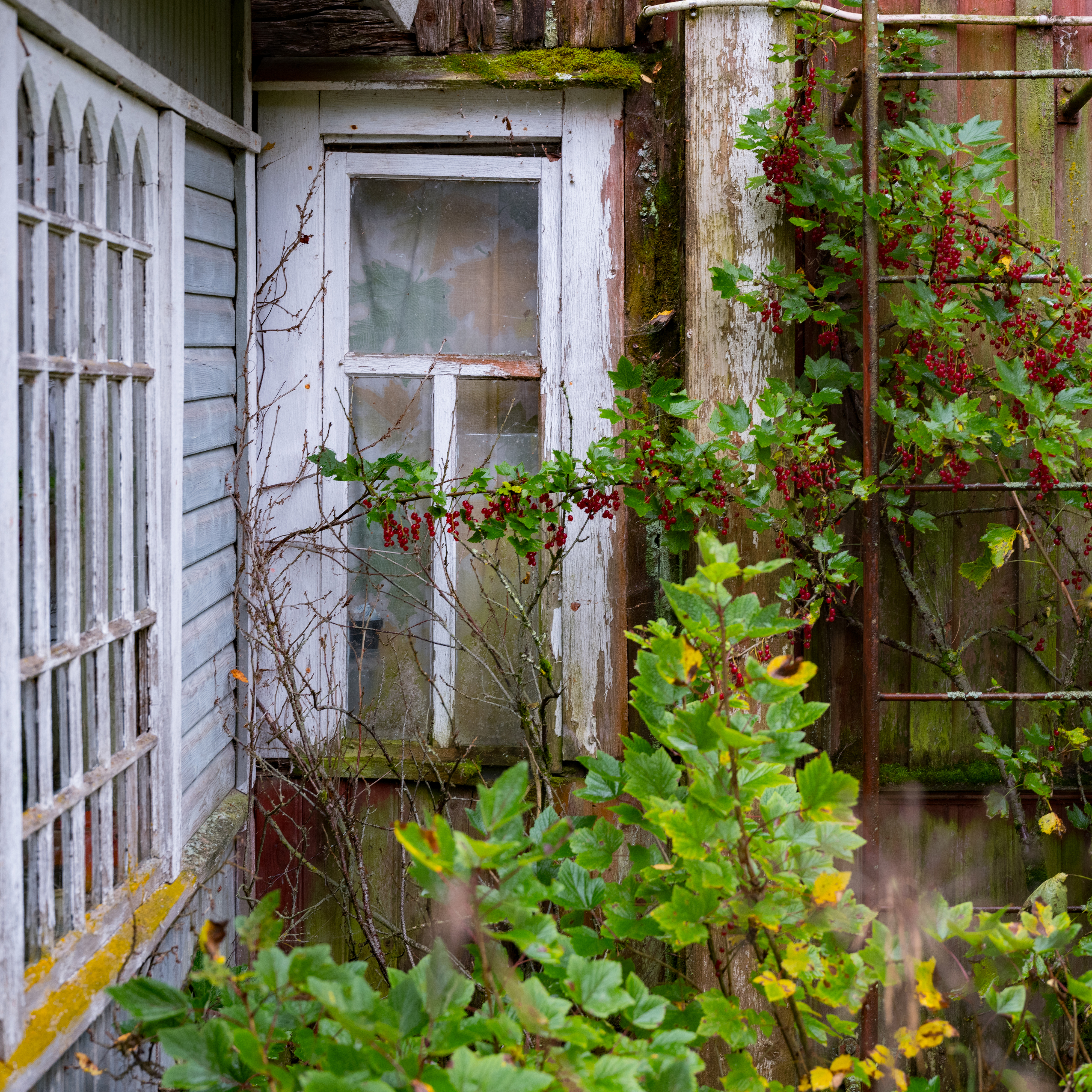 Bortglömda röda vinbär vid ett vackert ödehus. Både hus och vinbärsbuskar var säkert älskade en gång i tiden. Bären var goda i alla fall. Bilden är tagen i generöst regn och på fri hand. Jag önskar att jag haft gummistövlar, ja helst vadarstövlar, för att vandra genom en övervuxen gård i regn leder till dyngblöta skor och byxor. Vad gör man inte för en bild...