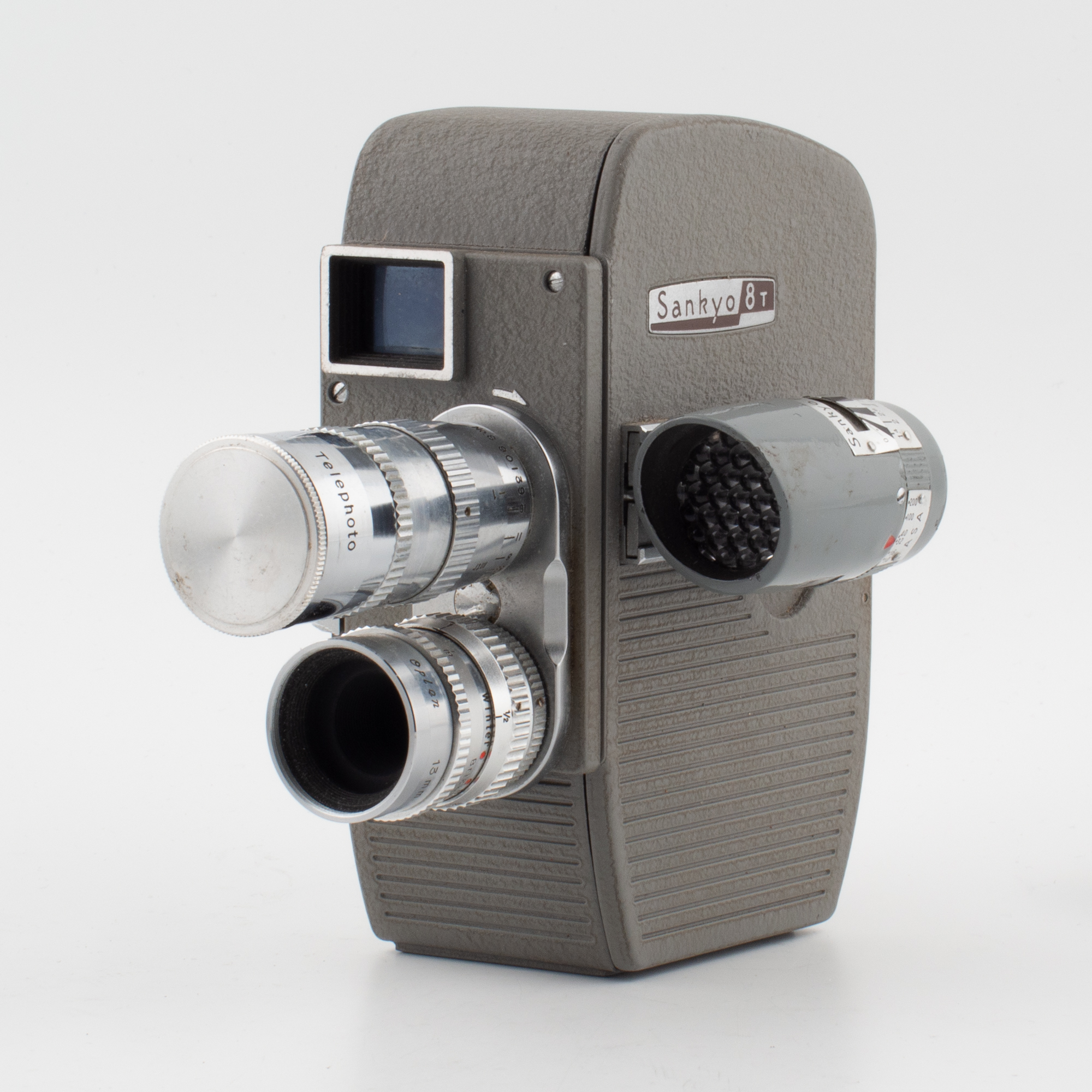 Den kamera du ser på bilden är en Sankyo 8T från vår egen samling. Det är en dubbelåtta-kamera från 1959 med två utbytbara objektiv som du kan vrida till det objektiv du vill använda. T står för Twin då den har dubbla objektiv. Den fanns också som en 8S med endast ett objektiv, och en 8E med plats för tre objektiv. Undertecknad har en gång i tiden haft kassettdäck STD-3000, skivspelare, receiver SRC-4040 och högtalare från Sankyo. De var riktigt stora på kassettdäck och kassettradio.