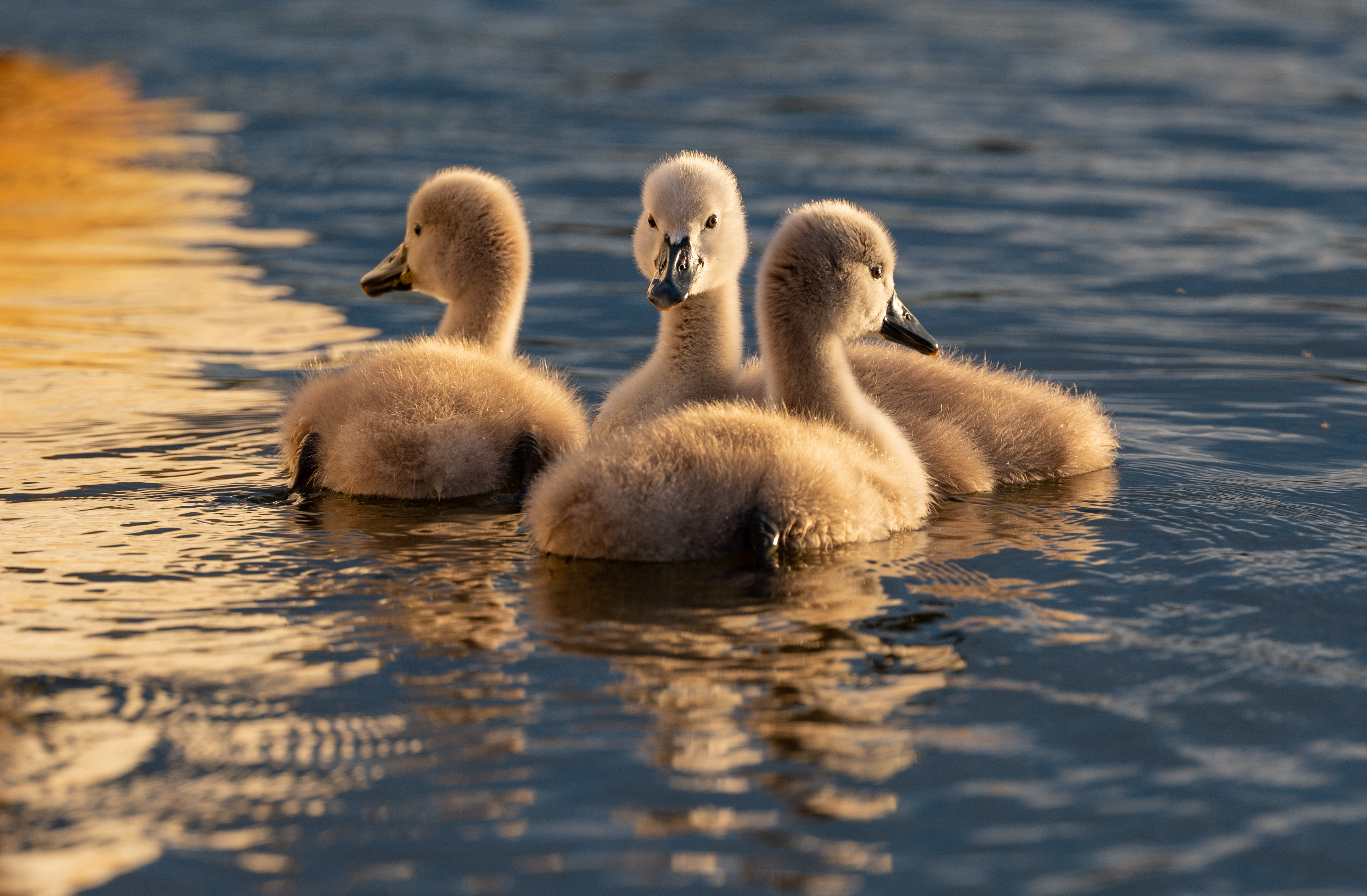 Denna bild är tagen vid Lövön i Holmsund, vid Umeå, som ligger i Norrland, och Norrland är största ytan av Sverige. En ståtlig svanpappa och en minst lika ståtlig svanmamma höll koll på sina ungar. Dessa ungar var nyfikna och simmade in under brygga och sedan ut på andra sidan där det hade smugit fram en människa som höll i GFX med den nya galet skarpa 250mm-optiken. Nu fick jag ändå beskära bilden hårt då de var en bra bit ifrån ändå.