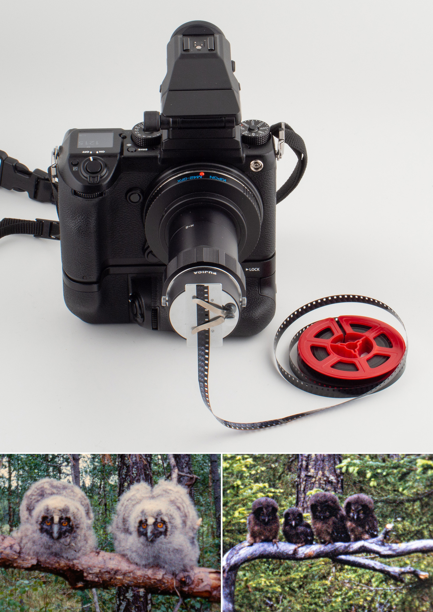 1971 så lanserar Fuji, nuvarande Fujifilm, Fujica ST-701 och till den släpper Fuji ett synnerligen ovanligt tillbehör med det udda namnet Macrocinecopy. Ett namn som faktiskt exakt beskriver vad det är. Det är i huvudsak ett verktyg för att kunna fotografera av enskilda bildrutor från 8mm eller 16mm smalfilm. Här sitter den på en Fujifilm GFX 50S. Självklart måste det provas men de flesta har inte smalfilm liggandes. Jag hittade ett par små rullar med bortklippt film som min mors morbror efterlämnat. Han var en stor naturvän och värnade mycket för ugglor. Han lyckades få de stora, och skövlande, skogsbolagen att lämna något träd på varje kalhygge för att ugglorna skulle ha någonstans att sitta. Bildkvaliteten på 8mm smalfilm är verkligen inte bra, och var definitivt aldrig tänkt att bli avfotograferad av en högupplöst mellanformatskamera. Men man ser i alla fall vad som är på bilden. Finns säkert bättre filmer att fotografera av men ugglorna var så gulliga.