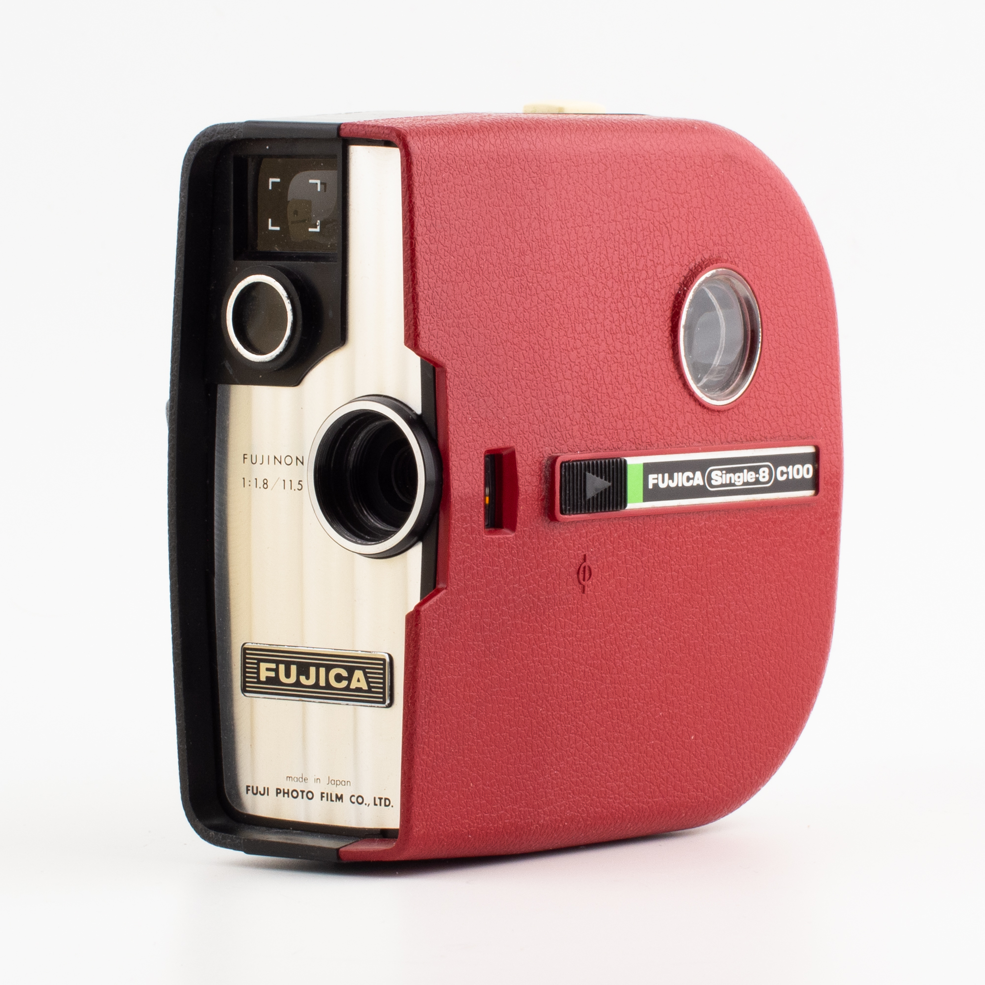 Vi har tre Fujica Single-8-kameror i vår samling, 2st C100 i beige och röd samt en P1. C100 tillverkades 1970-1971 och har en har en Fujinon 1.8/11.5mm med 19.5mm filtergänga. 124mm x 114mm x 62mm och väger 370g. P1 tillverkades 1965-1967 och har en 1.8/11.5mm med 19.5mm filtergänga. 192mm x 106mm x 37mm och väger 530g. Om du har en Fujica Single-8 liggande så får du här en kort historisk lista: