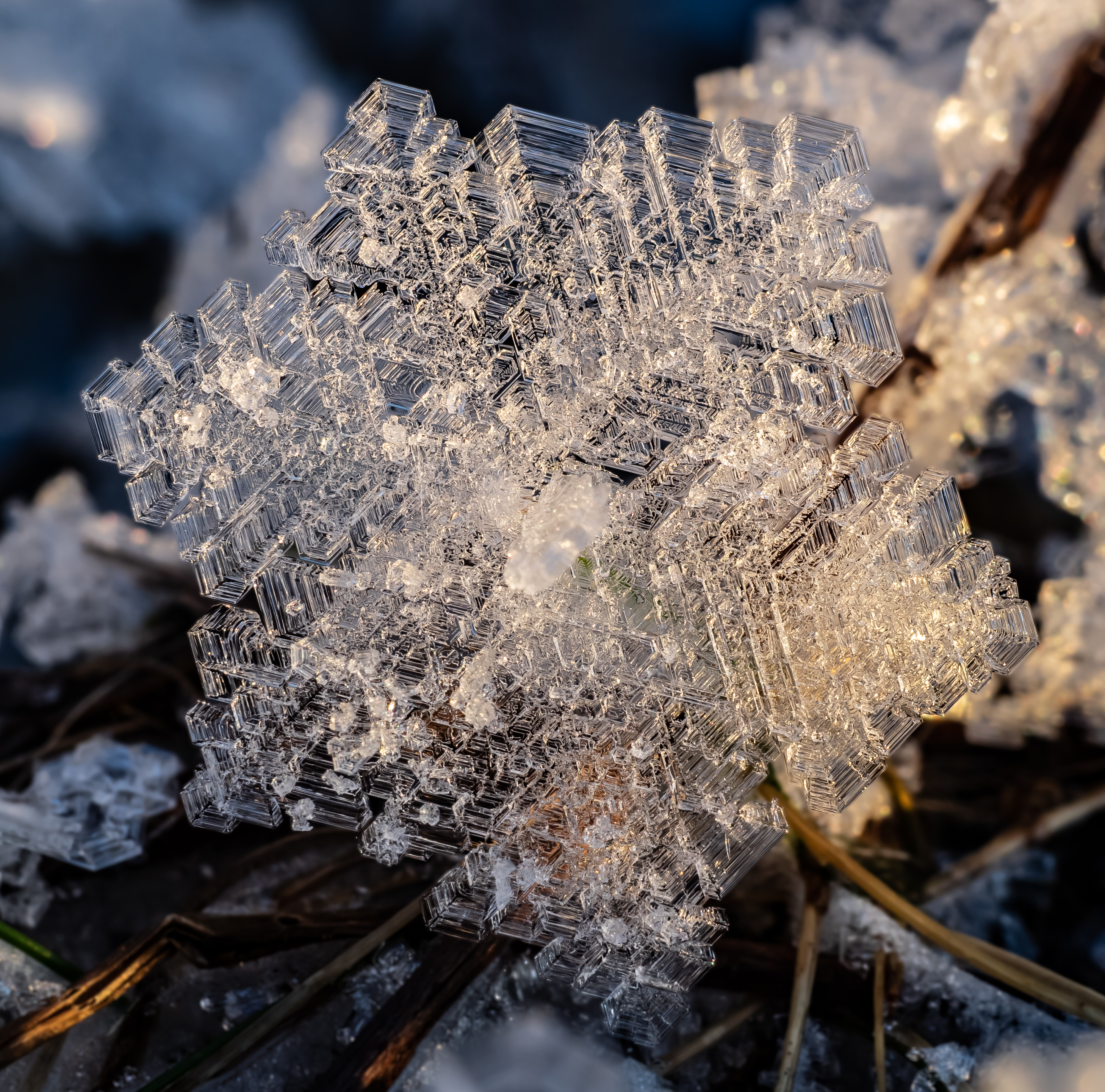 Här är en iskristall som byggts på allt eftersom av omgivande luftfuktighet. Det intressanta är att den påminner väldigt mycket om en snöflinga, vilket den inte alls är.