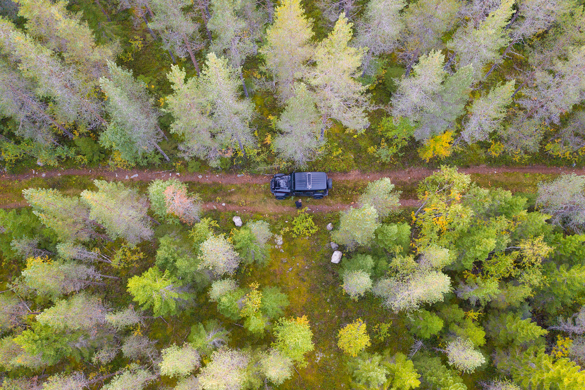 Skotare och skördare har verkligen brett mellan hjulen. Här drog jag upp drönare för att orientera mig omkring i området. Uppifrån så ser man verkligen hur brett det är mellan hjulspåren. Jeepen är ingen liten bil men när man kör med ett hjul i ett spår och andra hjulet i mittsträngen så känns den liten jämfört med de fordon som kört här förut.