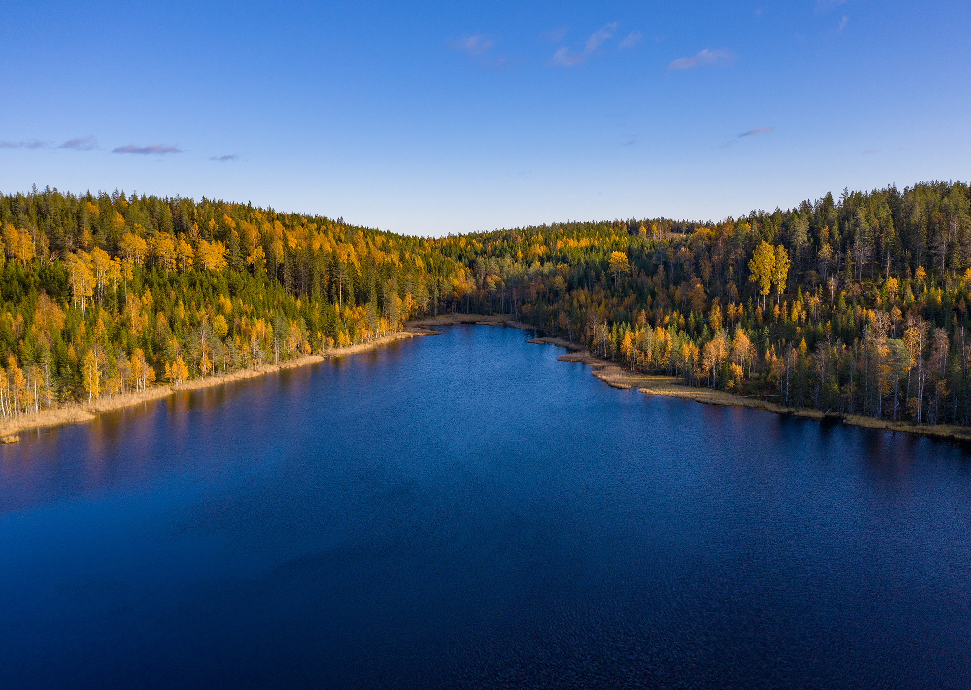Ibland tycker man något ser fint ut i telefonen som man använder till drönarens fjärrkontroll, och sedan när man ser på bilden hemma vid datorn så inser man hur mycket vackrare bilden var än på telefonen. Himlen reflekterar blått i sjön och den blir nästan onaturligt blå. Hur som helst så är hösten verkligen vacker. Ingen fantastisk bild men jag gillar den. Den känns verkligen Norrland.