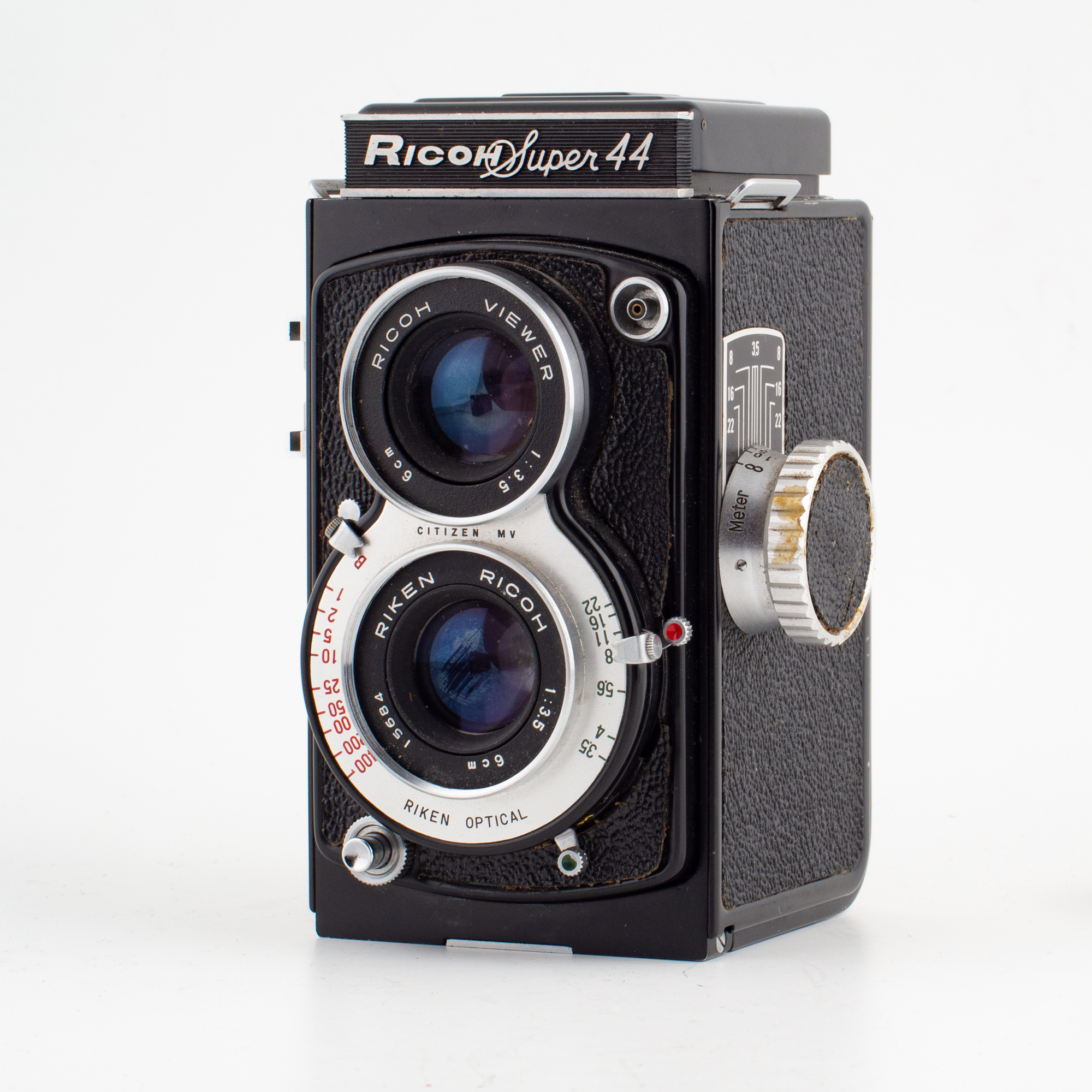 Hur som helst är det en trevlig liten tvåögd spegelreflexkamera vi ska titta på idag. En Ricoh Super 44. Den lanserades 1958 och en grov gissning är att mellan 10000 och 15000 kameror byggdes. Slutaren är en Citizen MV som ger 1/400s - 1s + B. Senare modeller verkar ha Citizen MX slutare. Den fungerar fortfarande på vårt exemplar även om långtidsverket självklart kärvar lite. Optiken är en Riken 60/3,5 med hela 10 bländarblad, dock bara med 3 linselement. Lite oväntat och långt före sin tid så har den blixtsko med synk-kontakter.