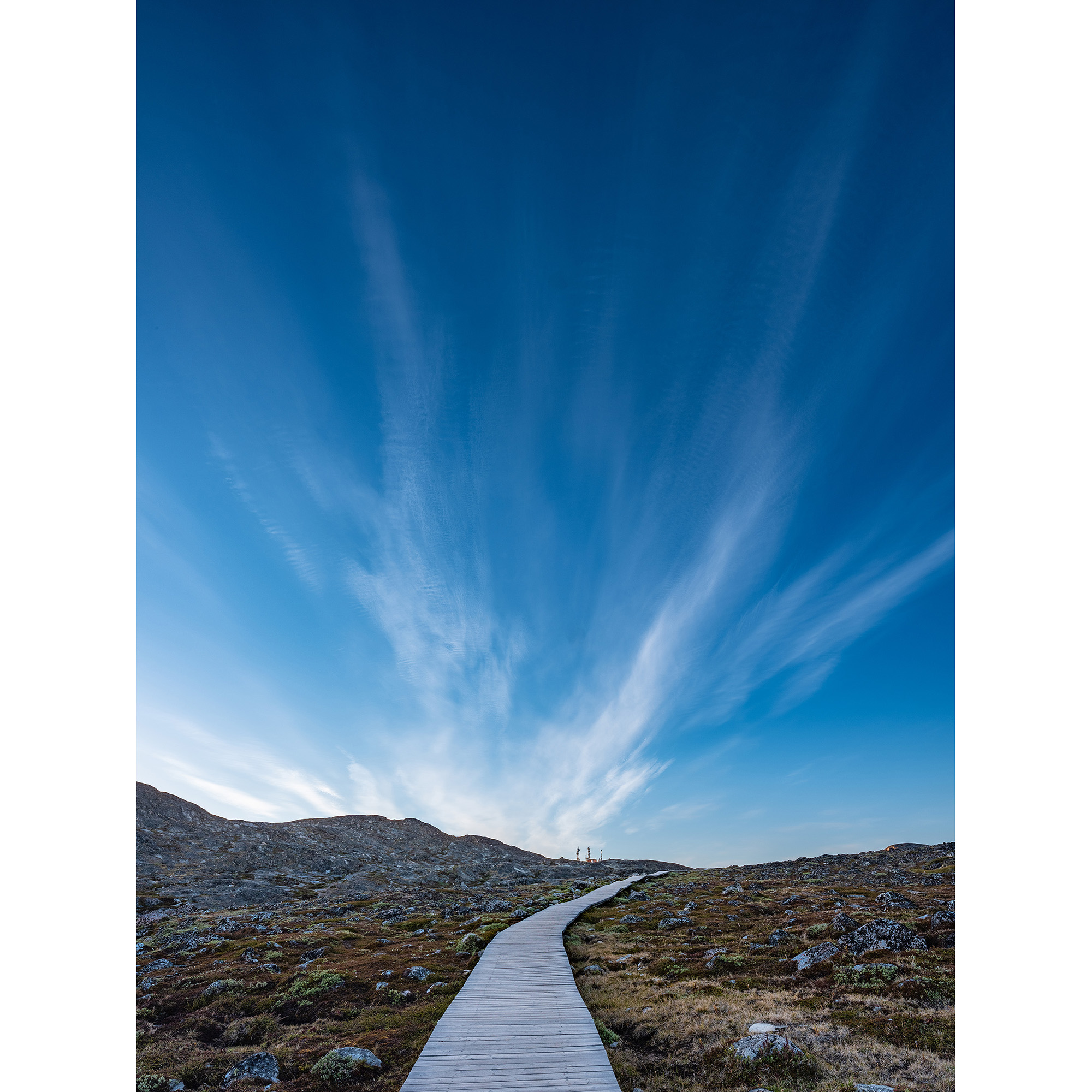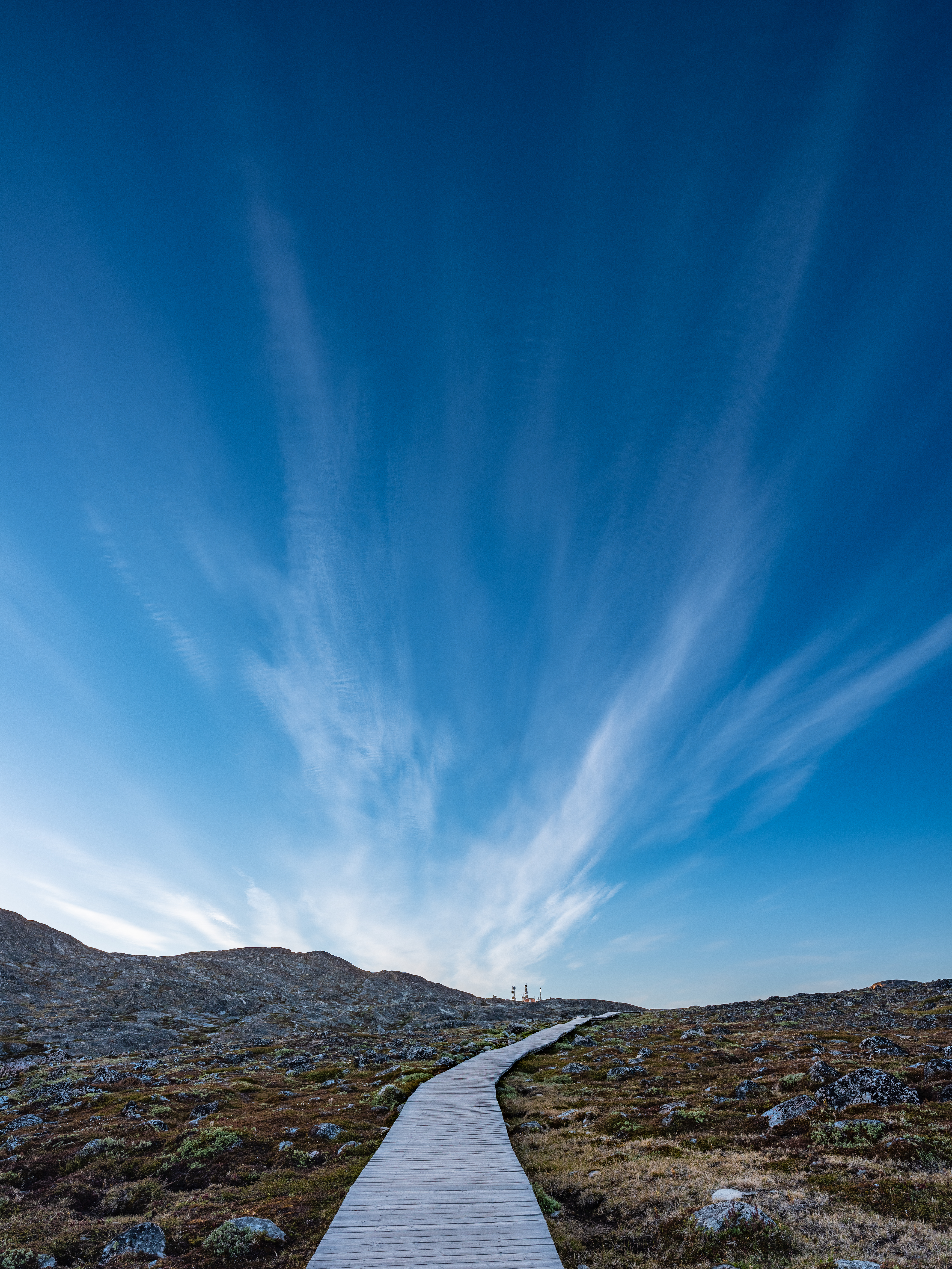 Klicka gärna för större bild på denna. En välordnad gångväg, ett kargt landskap som närmast påminner om en av Venus månar, en kommunikationsanläggning som från en Sci-Fi-film och moln som från någon av Riddick-filmerna. Det är vad man möts av efter 6 timmars vandring i bergen i Ilulissat på Grönland.