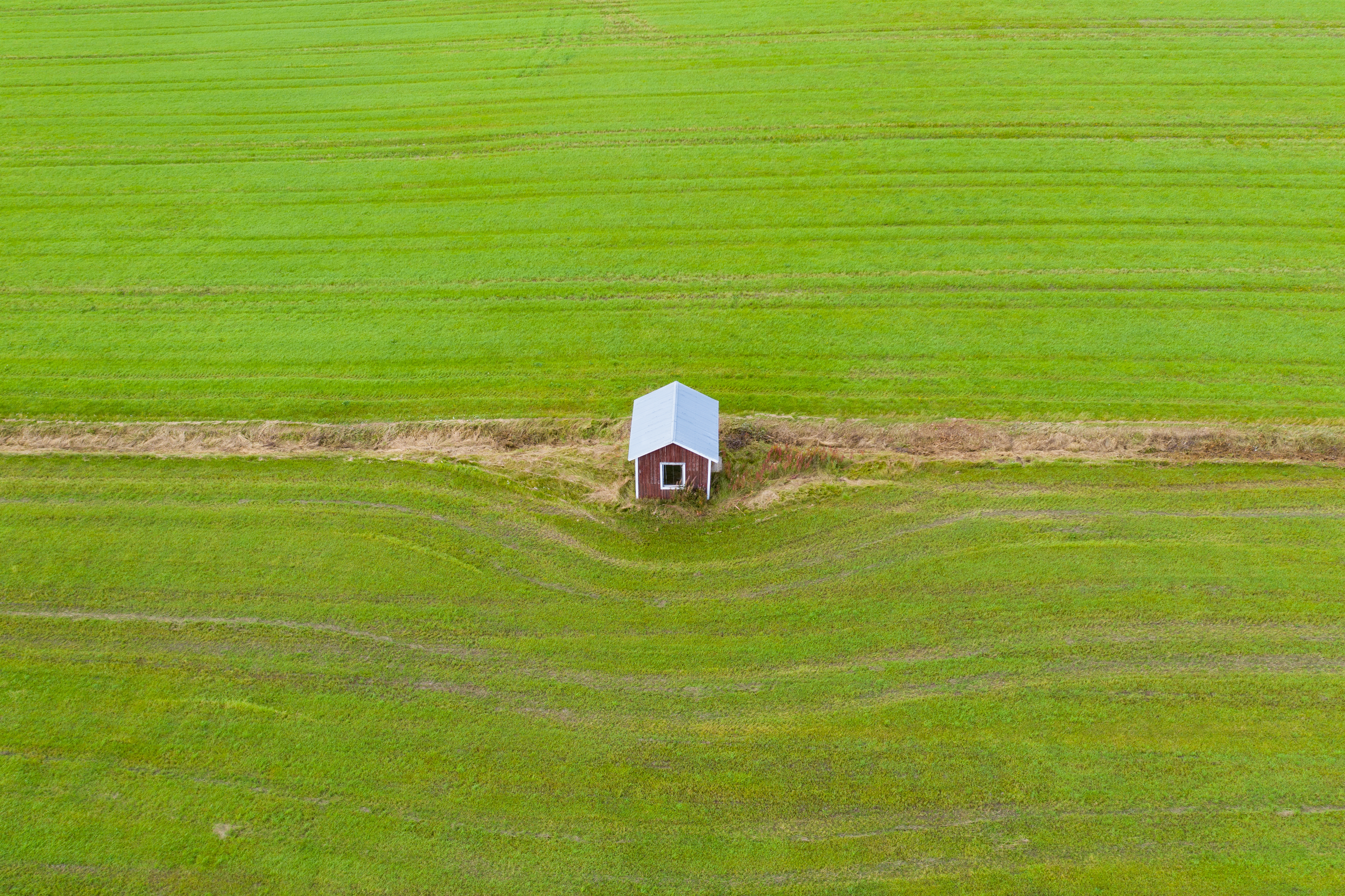 Jag tycker mönster i skogar och åkrar kan vara så intressanta att se uppifrån. Denna bild blev inte bra rakt ovanför för då såg jag endast ett plåttak, men så här lite snett ovanifrån så ser man både mönster och det lilla huset. Inget att sätta på väggen men ändå lite kul.