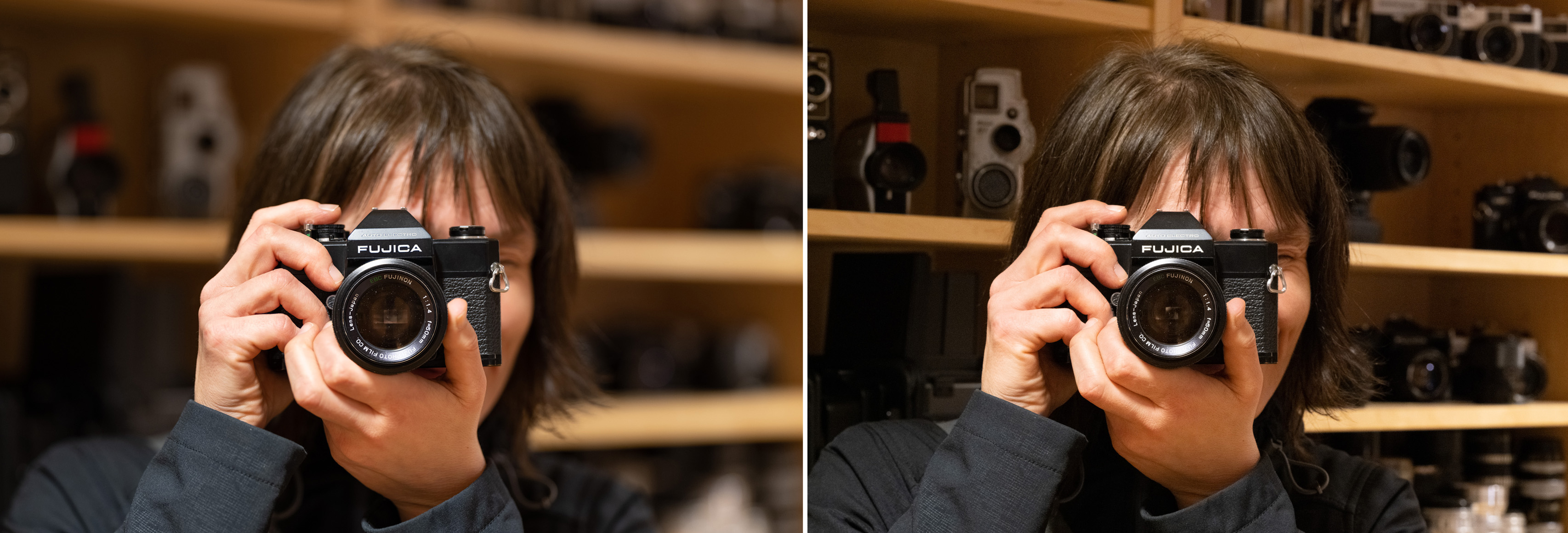 Den bild vi visar här ovanför är en bild på en kamera som hålls i av en tjej. Taget med stor bländaröppning vilket ger kort skärpedjup på bilden till vänster och taget med liten bländaröppning som ger stort skärpedjup på bilden til höger. På denna bild kommer några att säga: Oj, vilken fin bokeh, undrar vilken optik bilden är tagen med. Svaret är Fujinon GF 110/2. Någon annan kommer att säga: Synd att det inte var skarp bakgrund för jag skulle vilja se mer från ert museum. Vilket är förståeligt, kanske borde valt en ointressantare bakgrund, men bilden är tänkt att visa den kamera hon håller i. Och sedan finns det någon enstaka som vill ha allt skarpt, oavsett vad.