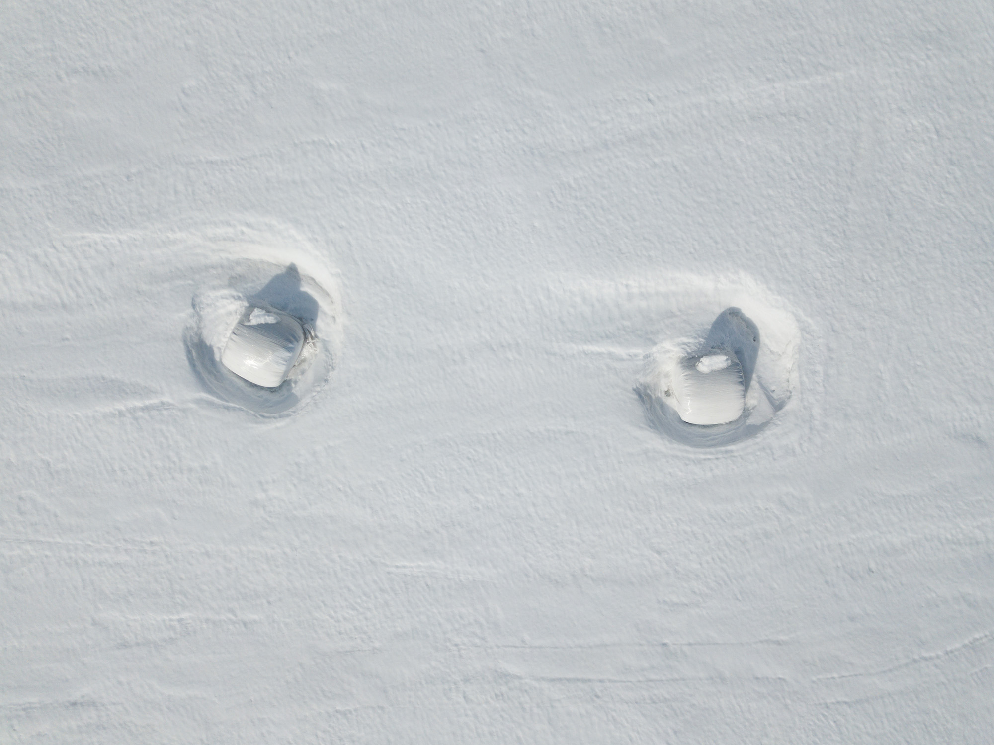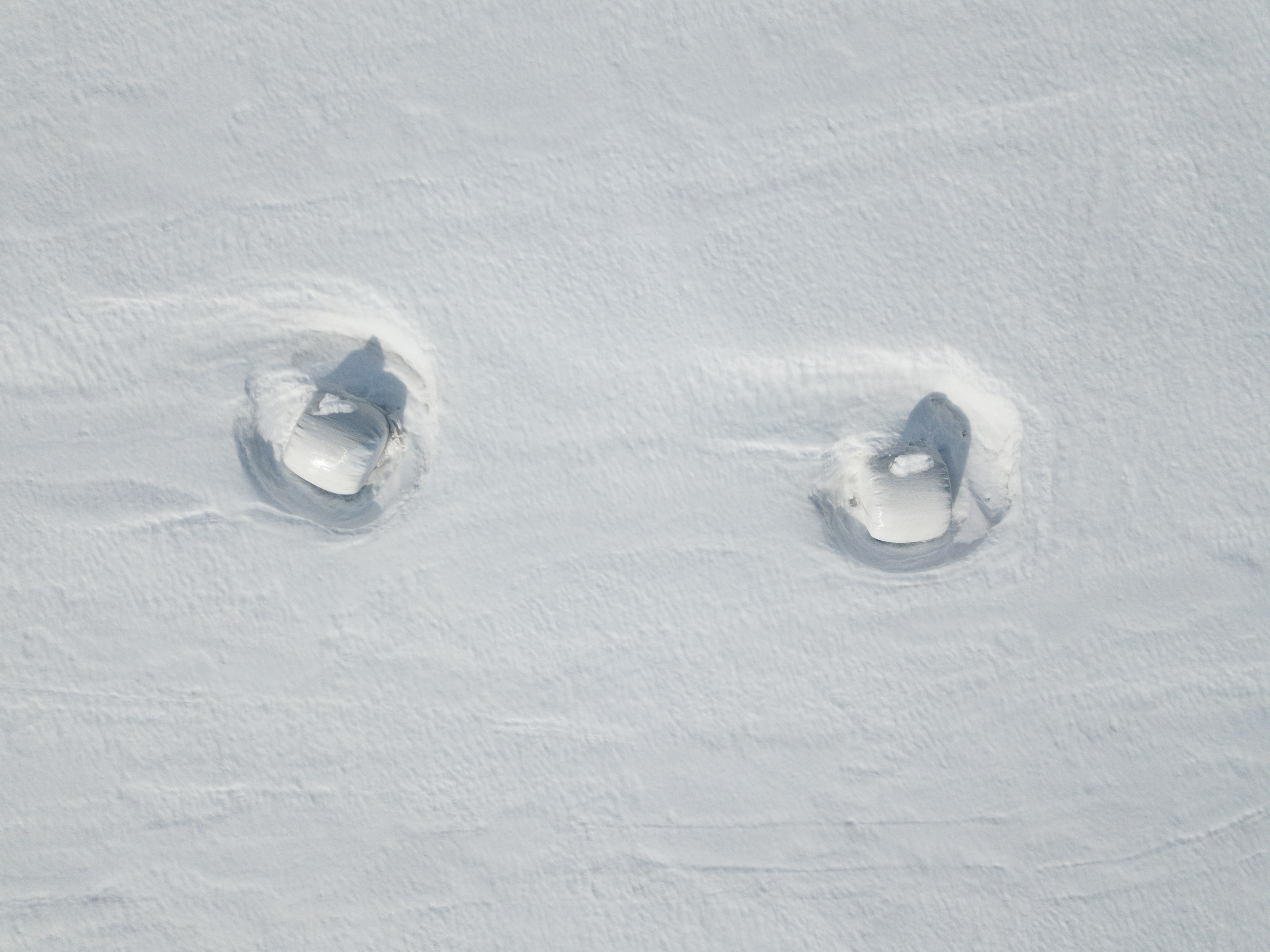 Ifall du inte ser så är det ensilagebalar som står på en åker och en snöstorm har format snön runtomkring dem.