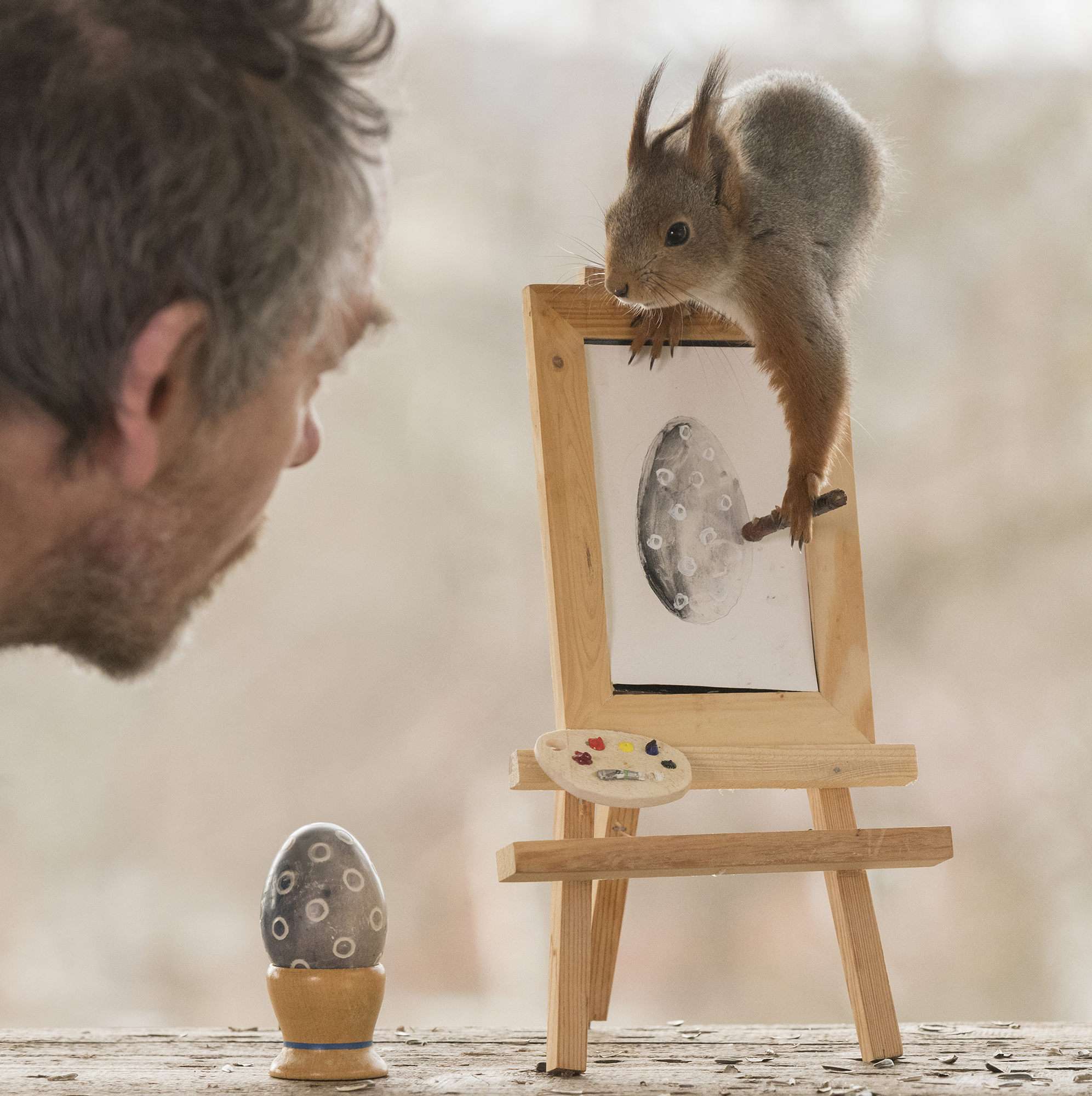 Vinnaren i tävlingen är Geert Weggen med en fantastisk bild med sig själv och en ekorre som brukar besöka hans gård så han har byggt en ställning till ekorren för att ta denna bild. En kreativ och rolig bild som kräver mycket tid och bra tajming att genomföra. Hemmapyssel som att måla ägg nu i påsk kan bli ensamt när vi har haft order om att inte besöka släkten, som tur hade han sin lilla kompis herr ekorre att göra det med!