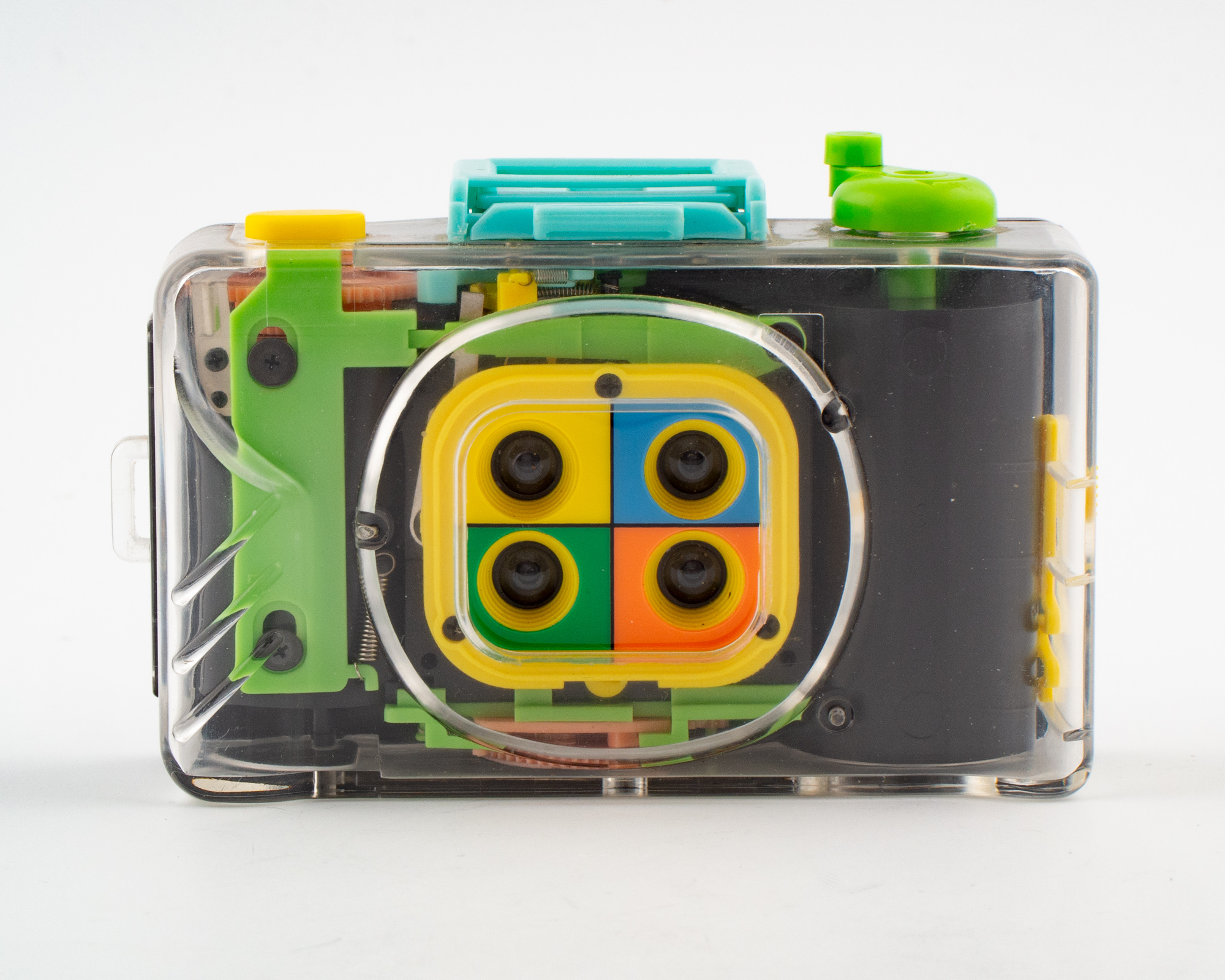 Här har vi en färgglad liten Actionsampler som tar fyra bilder i sekvens på samma bildruta. Kvalitetskänslan är obefintlig. Bildresultatet torde vara bedrövligt men det har vi inte testat. Helt byggd i plast. Alla möjliga färger på plastdetaljerna. Ändå blir man glad av att se den.