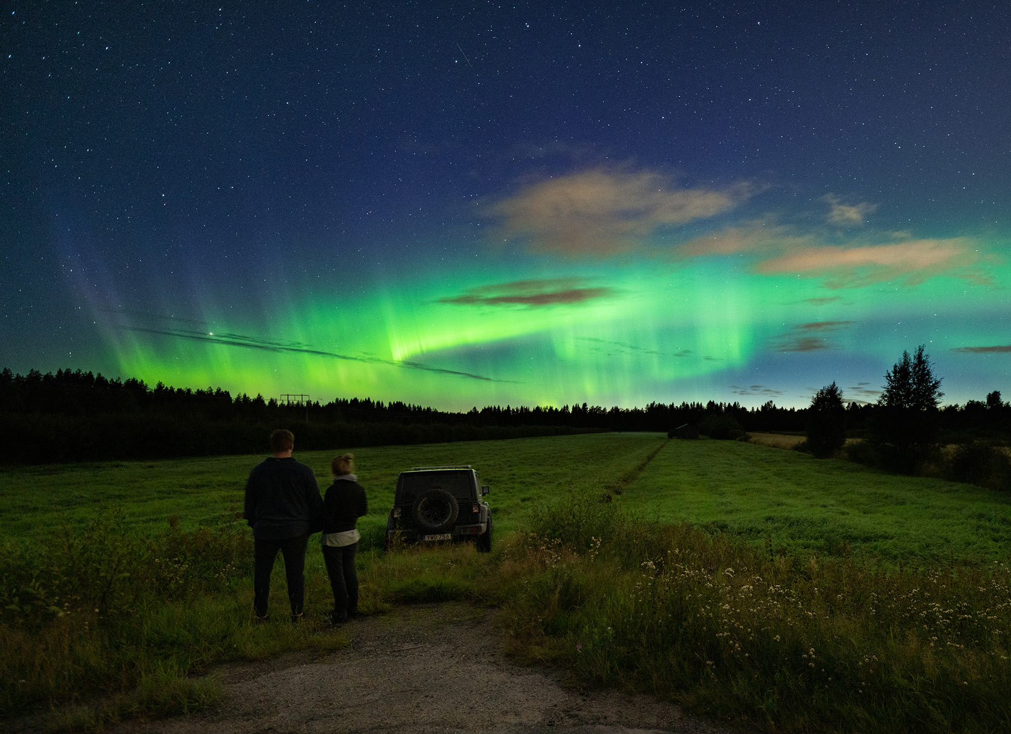 Äntligen har norrskenssäsongen startat på riktigt. Igår kväll var siffrorna låga och endast en svag båge låg över horisonten. Helt oväntat sprakade det till där uppe på himlen och fröken grön dansade vackert över fälten.