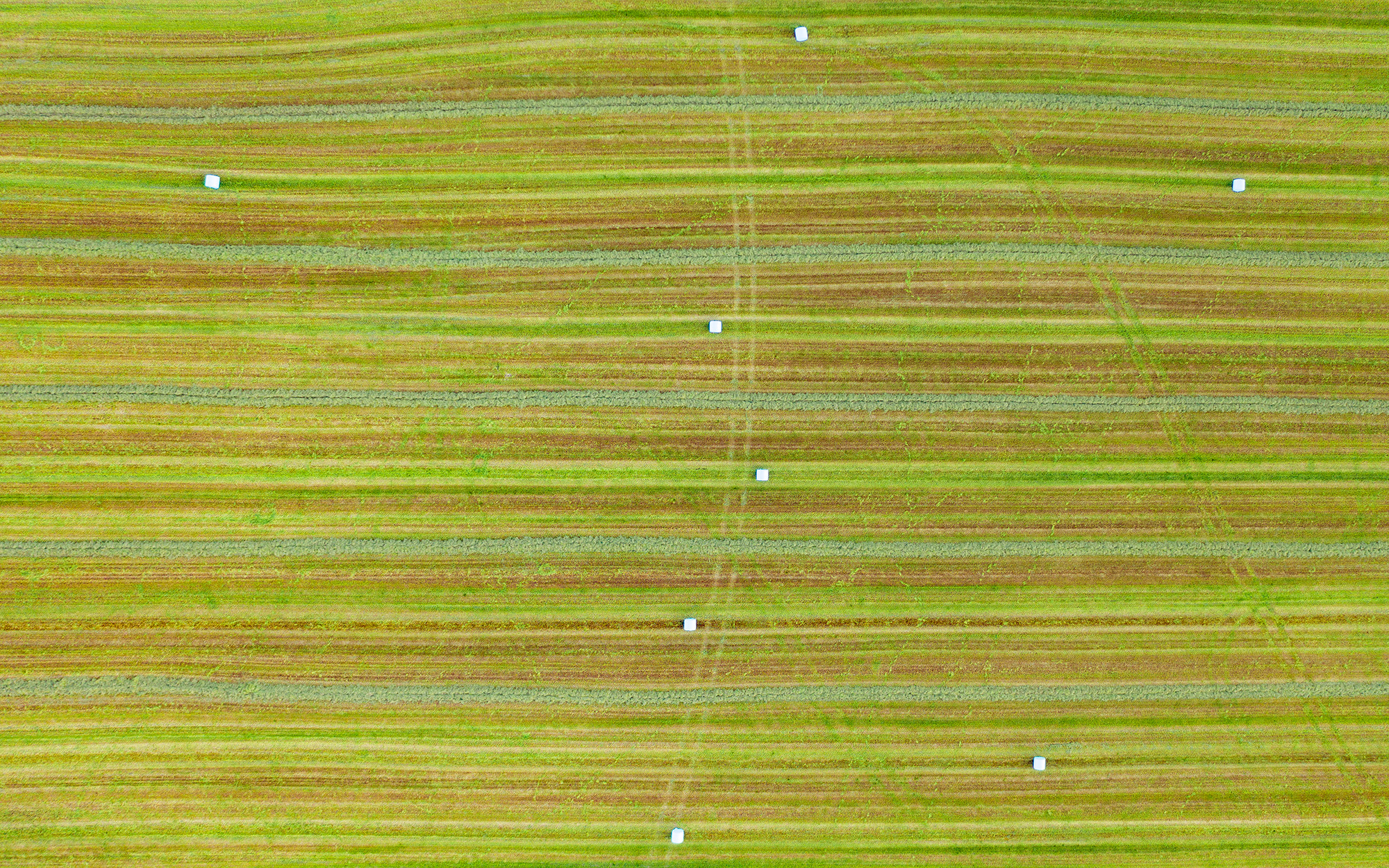 Åkrar kan ge spännande mönster. Här har en traktor fött ljusblå marshmallows. Någon har tagit en genväg över åkern vilket skapar ett intressant avbrott från helhetsmönstret.