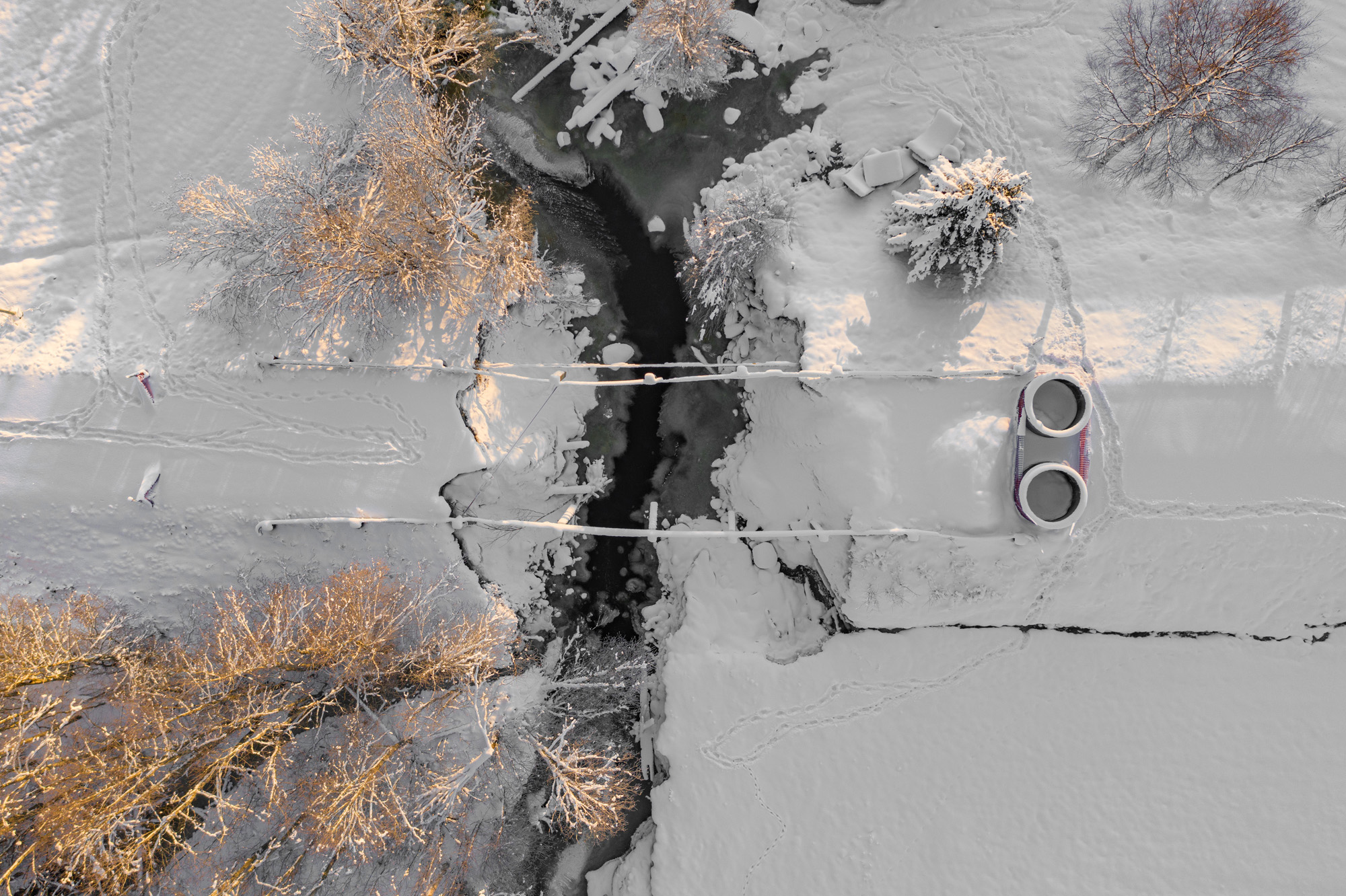 Denna väg har jag kört många gånger men denna gång var den avstängd. Jag drog upp drönaren för att se varför. Jag såg varför. Jag ser broräckena, men var är bron?