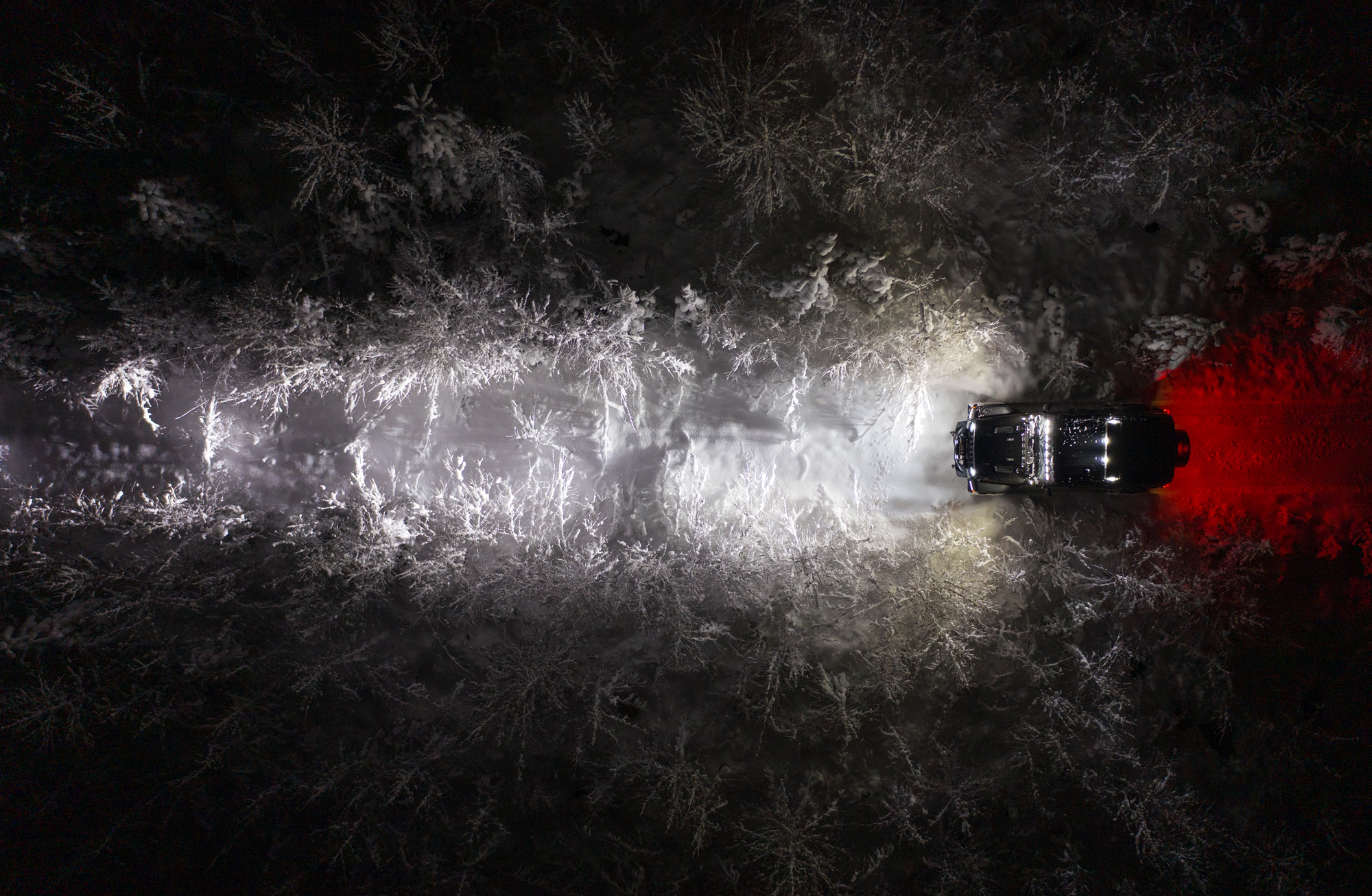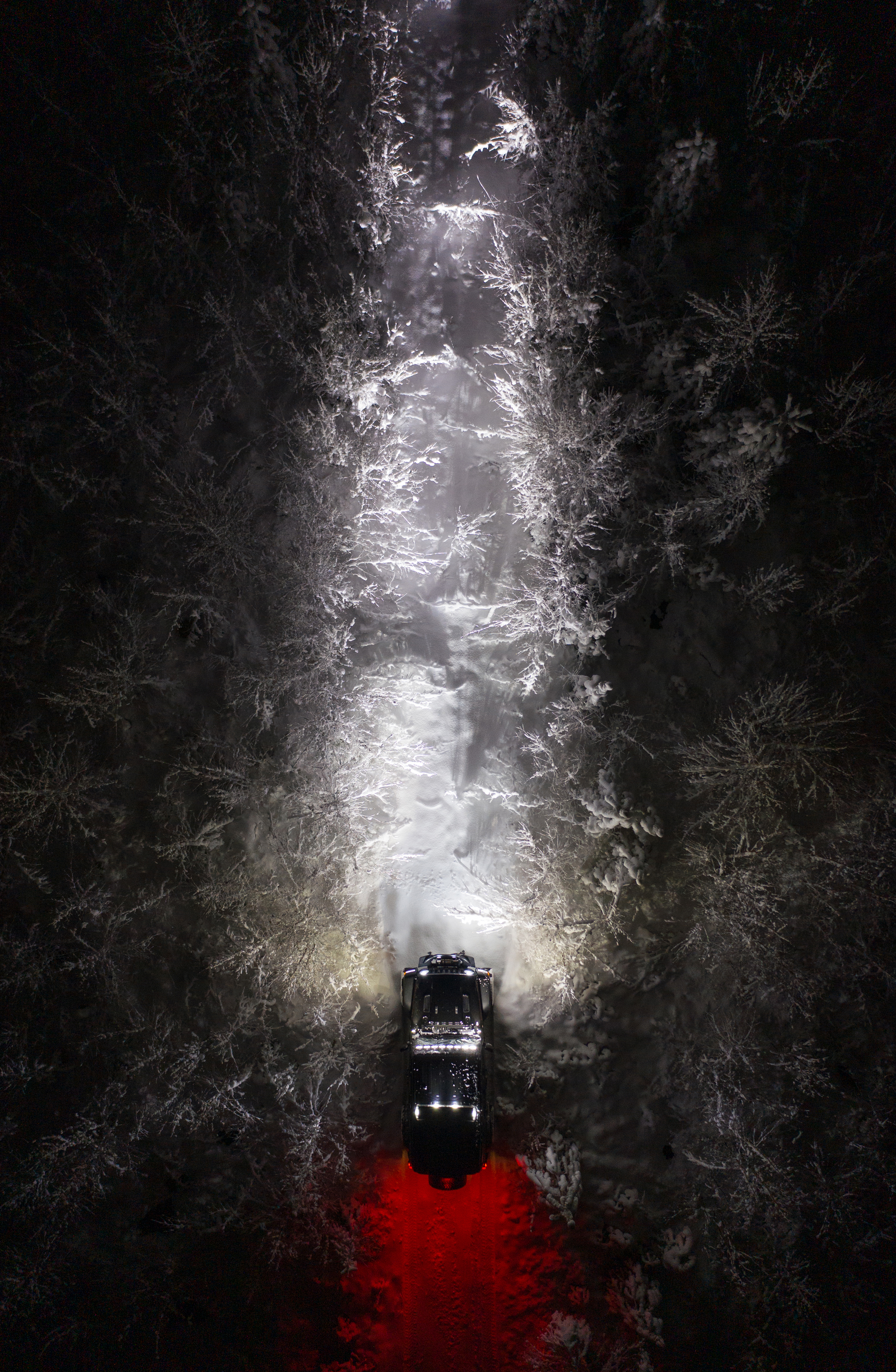 Det är så otroligt vackert ute i Umeå just nu. Träden är nedtyngda av snö. Här ser du en härlig skogsväg mitt i natten.