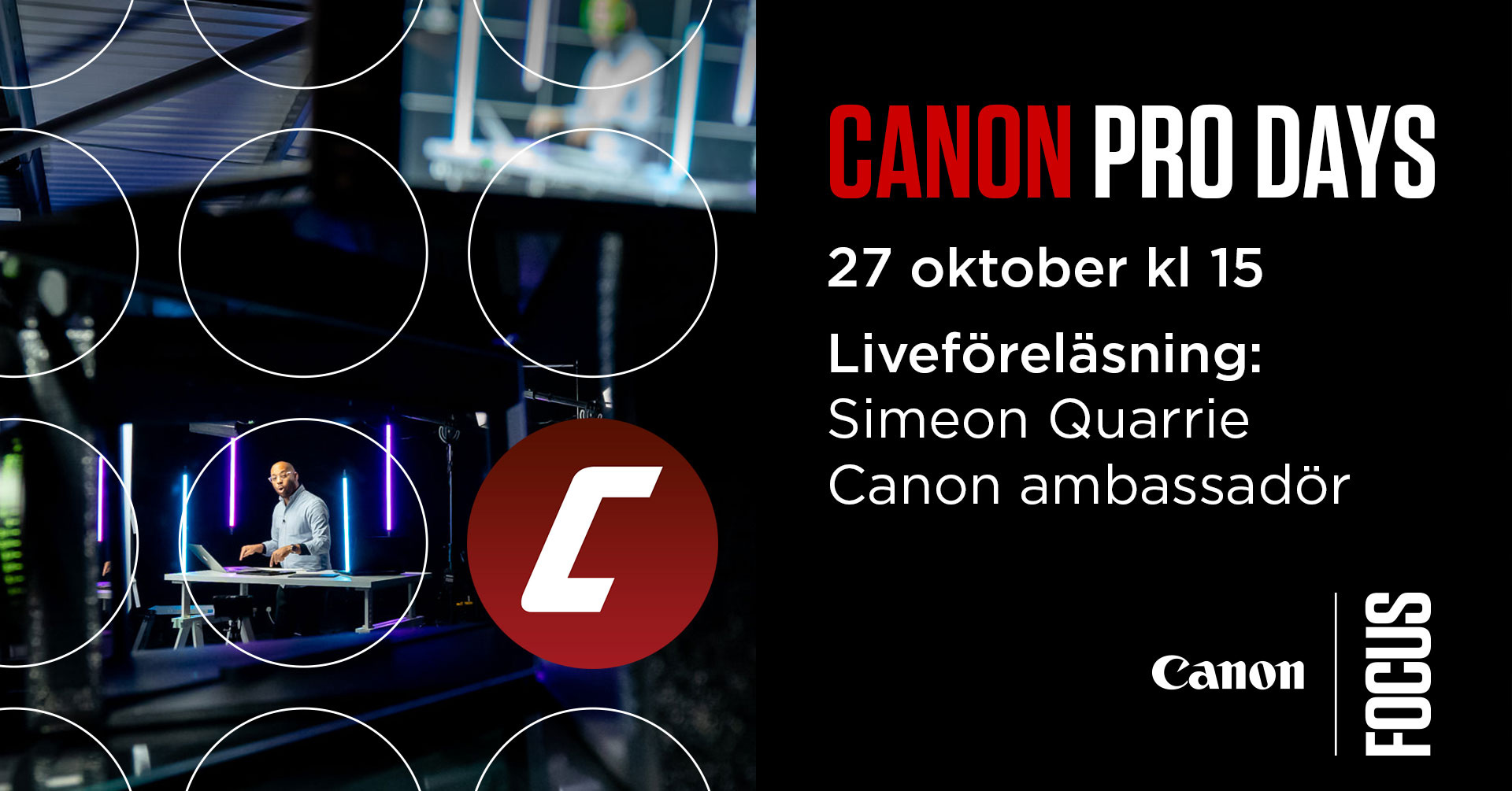 Föreläsningen hålls på ENGELSKA och livesänds på Youtube kl 15:00 den 27 oktober. Efteråt kan du medverka i ett Teamsmöte med både Canons produktspecialister och Simeon själv.
