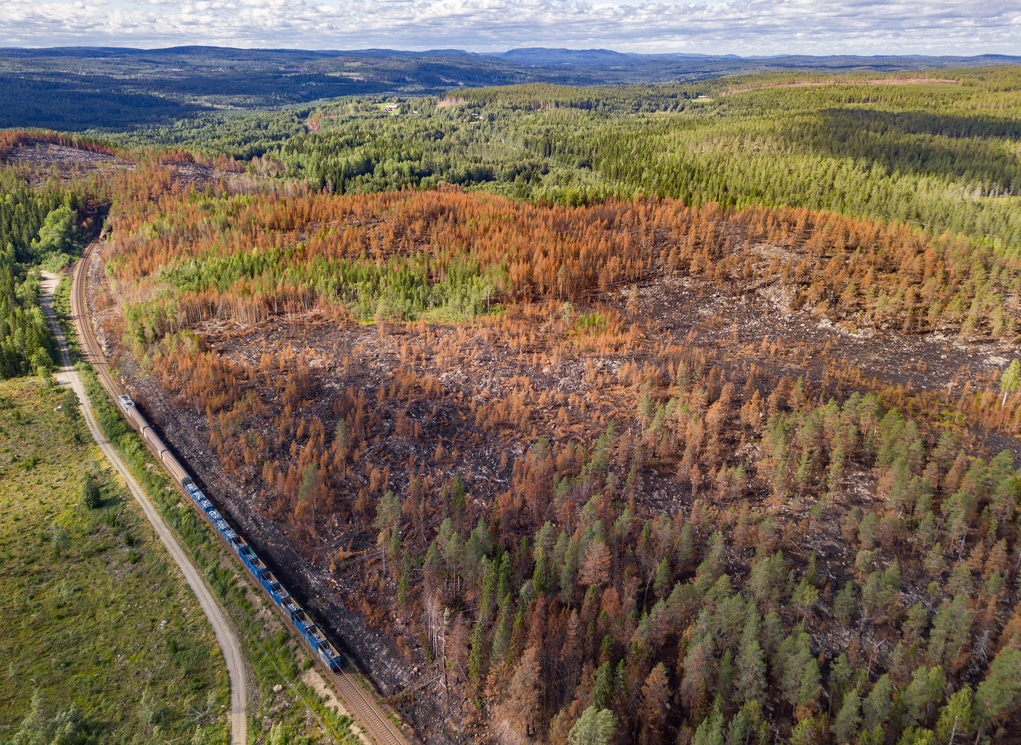 Sommaren 2018 så var det väldigt torrt i markerna och många bränder uppstod på grund av gnistbildning från tåg. Denna bild, som har spridningstillstånd, är tagen i närheten av Tallberg i Västerbotten. Uppifrån så ser man tydligt var branden startat och hur den har spridit sig. Ingen tvekan åt vilket håll det blåste.