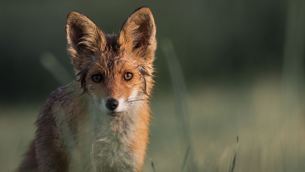 Jakob: Jag hade suttit ute och frusit en ovanligt kall natt i juli. Jag visste sedan tidigare att det fanns ett rävgryt i närheten och att rävungar brukade leka på ängen nära mitt gömsle. När klockan slog 6 på morgonen kom denna rävunge travandes över ängen, rakt mot mitt gömsle. Gräset var fortfarande blött av dagg och hans päls var våt. Han stannade i ungefär en minut och lyssnade nyfiket på ljudet från slutaren, innan han sprang iväg igen.