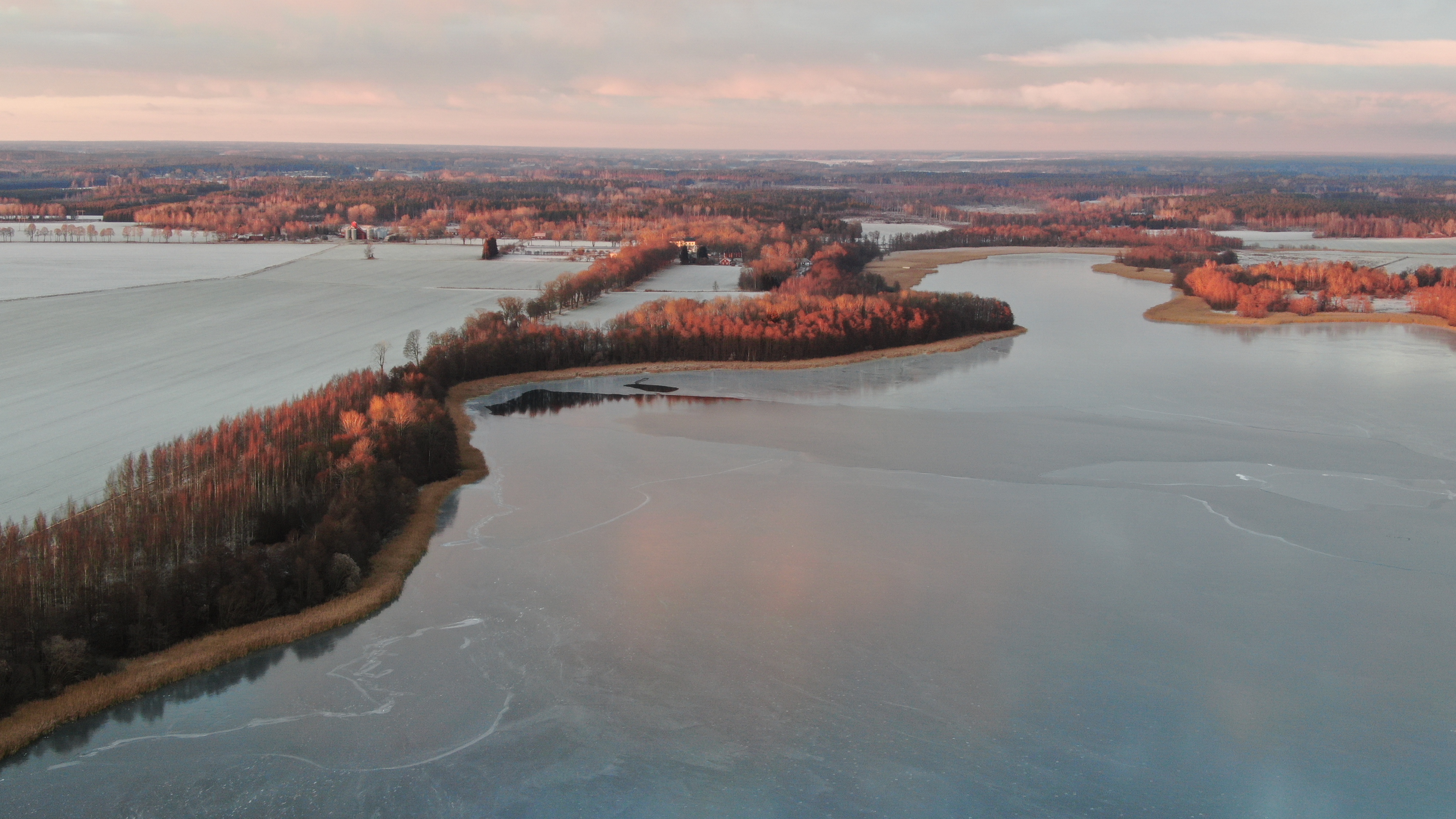 Mattias: En vacker bild från slutet av november. Visar hur isläggningen tagit fart på vår sjö, Långsjön, här i Björklinge. Herrgården som syns i bilden är Sätuna säteri.