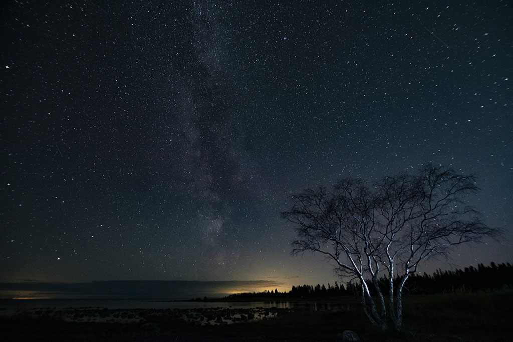 Tur nog står också ett mycket fotogeniskt träd där ute på udden som man kan använda i förgrunden, även om jag önskat en bättre belysning än en halvdålig pannlampa för att ge det lite "stjärnglans".